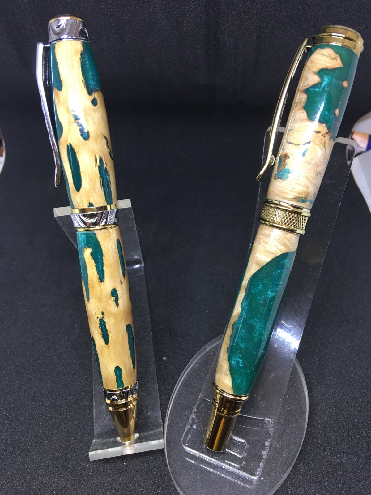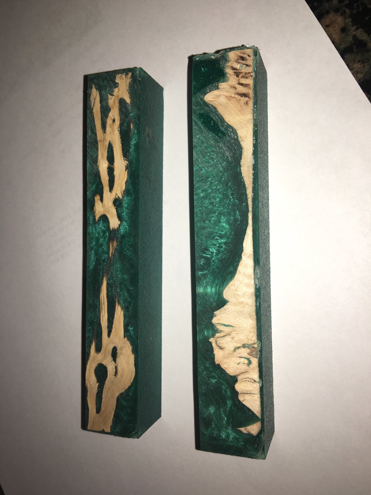 I made these blanks at a demo on casting for my woodturning club last week. The blanks came out great. On the left is a cholla cactus in Alumilite Clear colored with Caster's Choice Emerald Green and Brilliant Blue. On the Right, the same formula with a Big Leaf Maple Burl. The second photo shows the completed pens - a Chrome and Upgrade Gold Ultra Cigar with the Cholla and a Jr. Harold in TiGold with the BLM burl. Sorry about the quality of the photos, still waiting for my new photo tent set up.