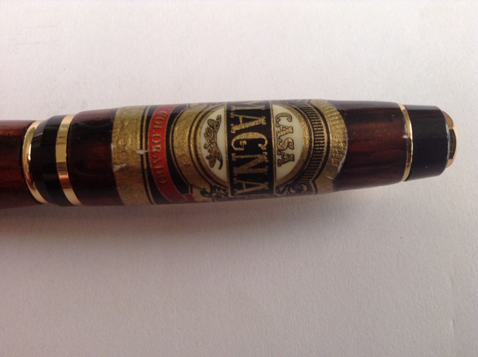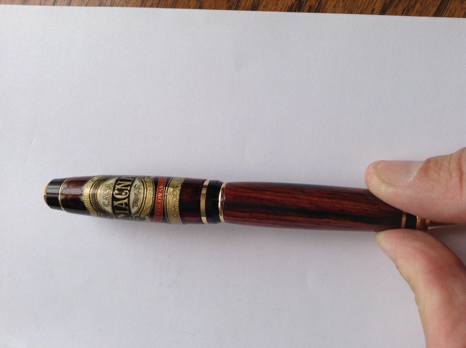 First for the disclaimer and a thank you. The band I used s from one of my favorite cigars but not a pristine one. The are some little nicks in it. I figured why waste a good band on an experiment. Of course that would be a good excuse to get more cigars. And a thank you to the great members of this site who are so willing to share information with a new guy. It's a coco bola with a woodcraft cigar pen components. All advice and constructive criticism is welcome.