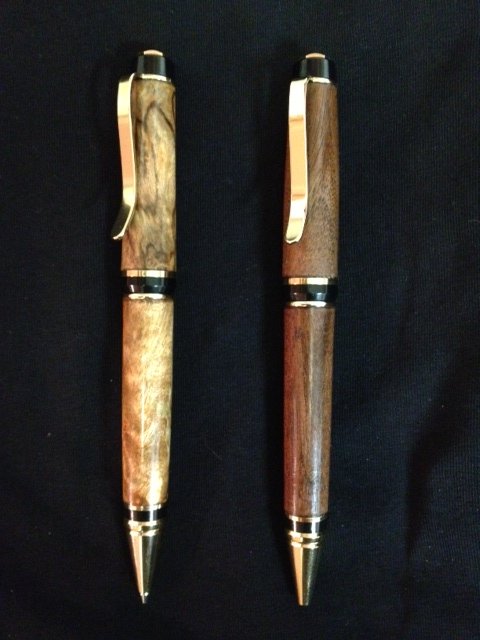 My guess is the one is a spalted maple burl and the other is a walnut?? Unfortunately, this was one of those grab bags I purchased from Woodcraft and I am not knowledgable enough to determine.