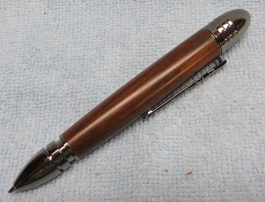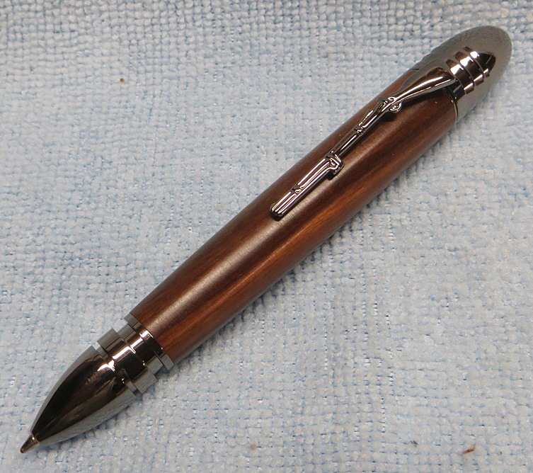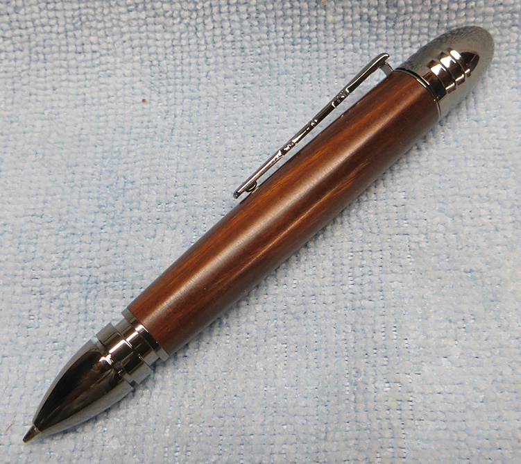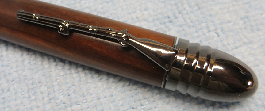 This is my first Civil War pen. It's obviously a short fat pen. The cap replicates a Civil War era Minie Ball bullet, and the clip is an 1861 Springfield musket. The wood is supposedly genuine lignum vitae, finished with Watco Danish oil. I didn't like the pen at first, but it's growing on me.