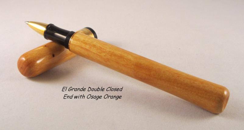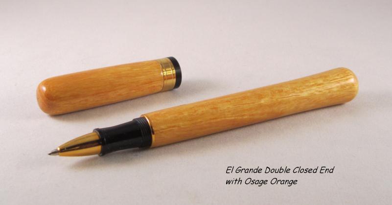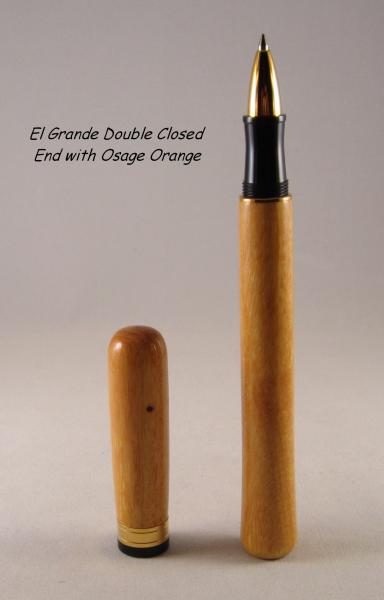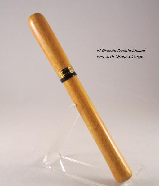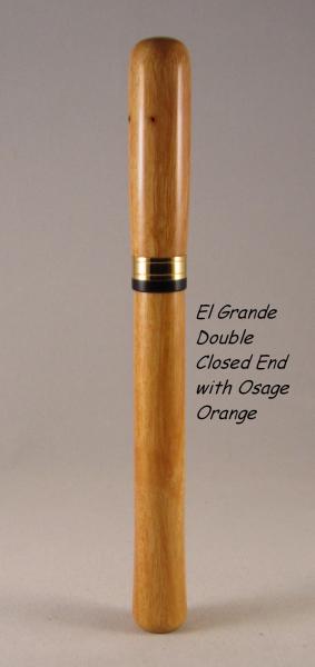 Well I received my closed end mandrels from Ariz. Sil and couldn't wait to try a closed end pen. So I grabbed an El Grande and made a double closed end with Osage Orange! Have not turned that before - sweet! This was kind of fun and perhaps a bit whimsical.:biggrin: The overall length is 6 1/2 in, capbarrel is is 2 3/8, barrel is 3 7/8