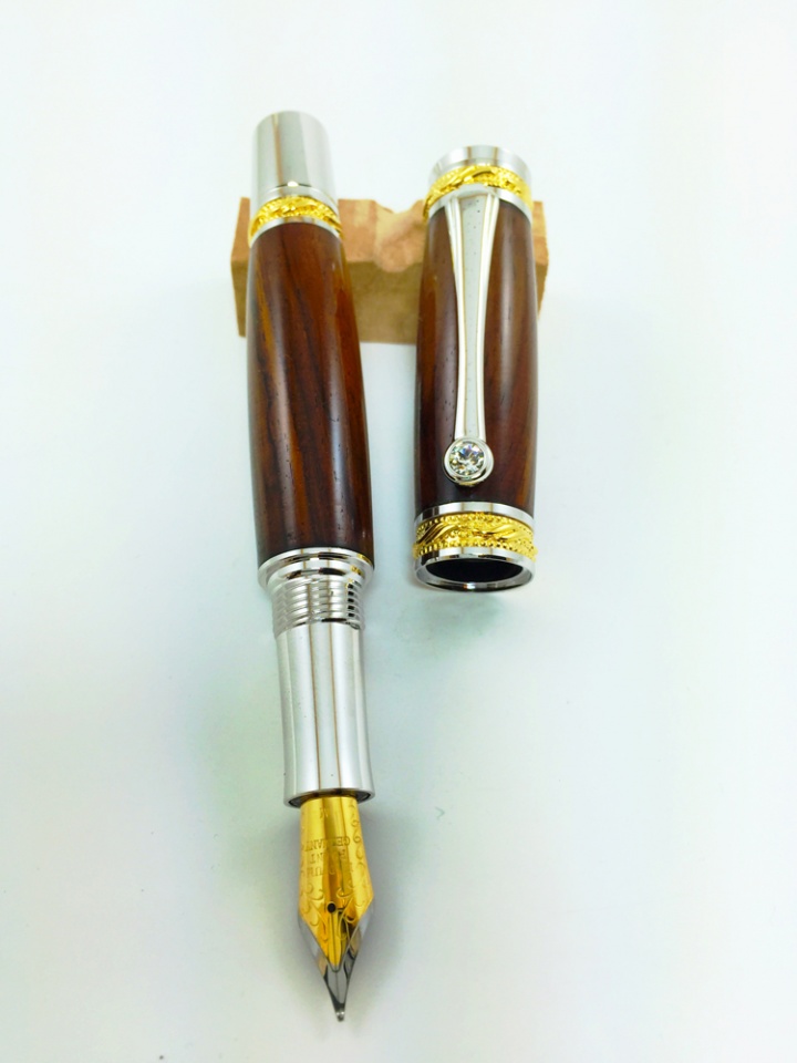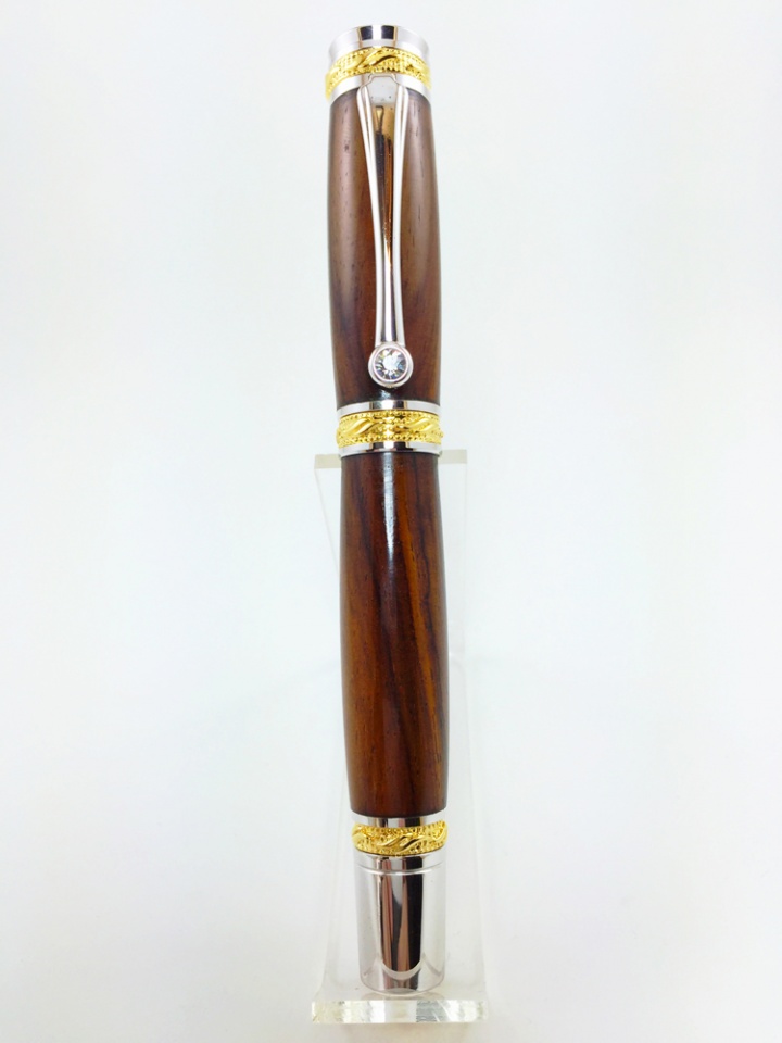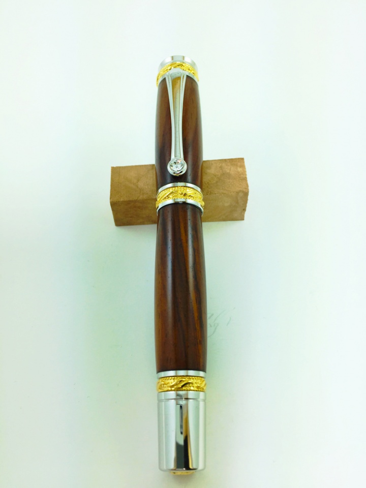 This my first attempt at using Cocobolo. It went on a Majestic pen and is finished with Pens Plus instead of CA. I certainly got an education about using Cocobolo and how caustic the wood is. The dust is absolutely an irritant for those of us with allergies and I will wear a mask henceforth. All in all, the Cocobolo finishes beautifully and makes a gorgeous pen to say the least. I did learn that it is a very oily wood on its own too.