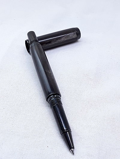 A couple of weeks ago I got an email from someone who had bought a pen from me that said he wanted another one as a gift for a friend. An all black rollerball. The only black rb that I found was the Caballero from Exotic Blanks https://www.exoticblanks.com/Caballero-Rollerball-Pen-Kit-BTi-BTi.html They also have it in Black Chrome. Finding that I msg'd him back with various options as to components and materials (Ebony, Acrylic or Indian Buffalo horn) and a price range from high dbl digits to low triple digits. I knew he had good taste when he got back to me with the most expensive and potetially prettiest combo. Black Ti and IBh.