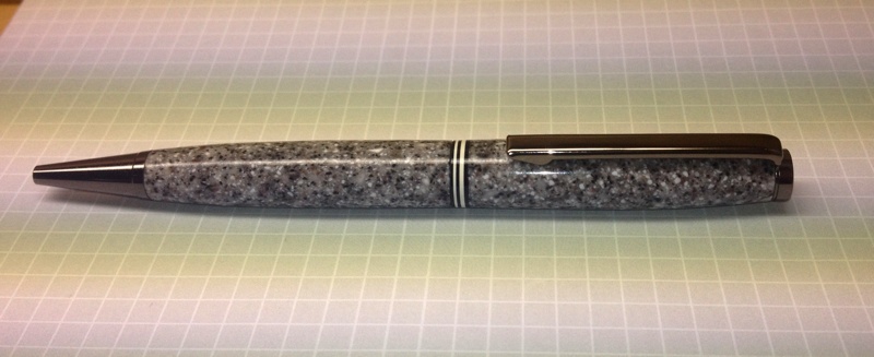 I bought a box of Corian scraps on eBay and have enjoyed turning them, although they're a bit narrow for most pen kits. Here are the first two attempts: a credit card pen and a slimline, both with custom bands made from pickguard material.
