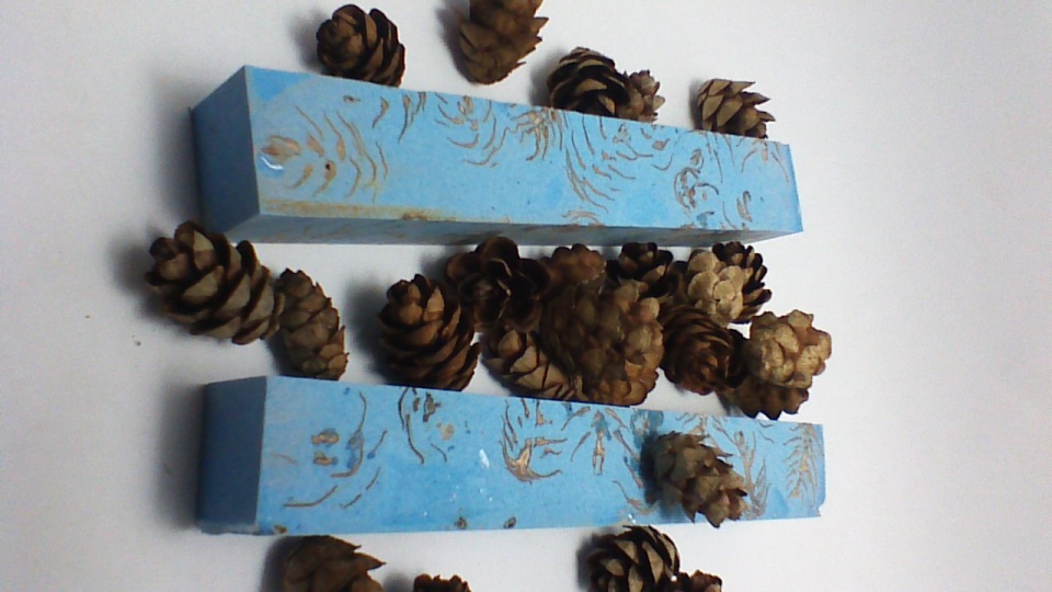 I agree that that shade of Blue is dull (but it's a trial run!). And more pine cones; possibly break they up and have more visable pieces. Ot smoosh them together for a greater density.