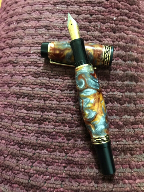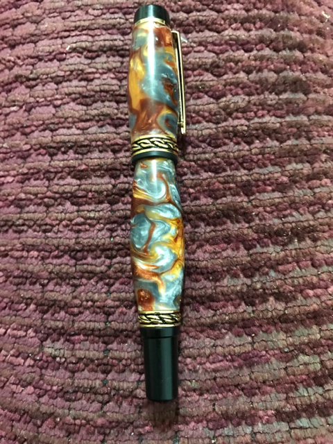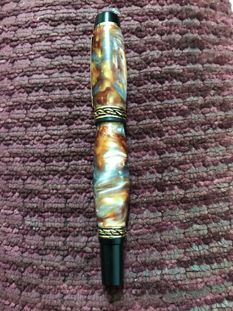 I turned my first fountain pen today. I used a molten metal (acrylester) blank. This pen is for an attorney friend of the family.