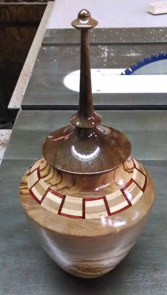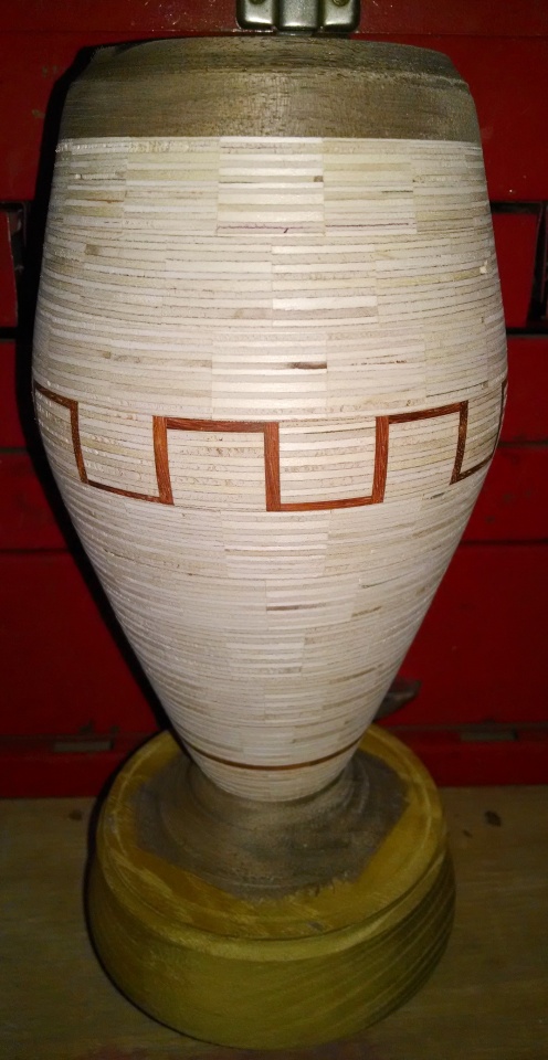 I got a wild hair in my headstock and tried to do a fully segmented hollow form out of birch ply, padouk, and walnut. The form blew off while beginning the clearing of the inside. It broke at the first layer in the middle of the ply. It was in a bowl stabilizer but it popped free anyway. I was able to repair it which is the picture shown. I think it will have to be fully stabilized to turn it successfully. The outside is NOT fully shaped.