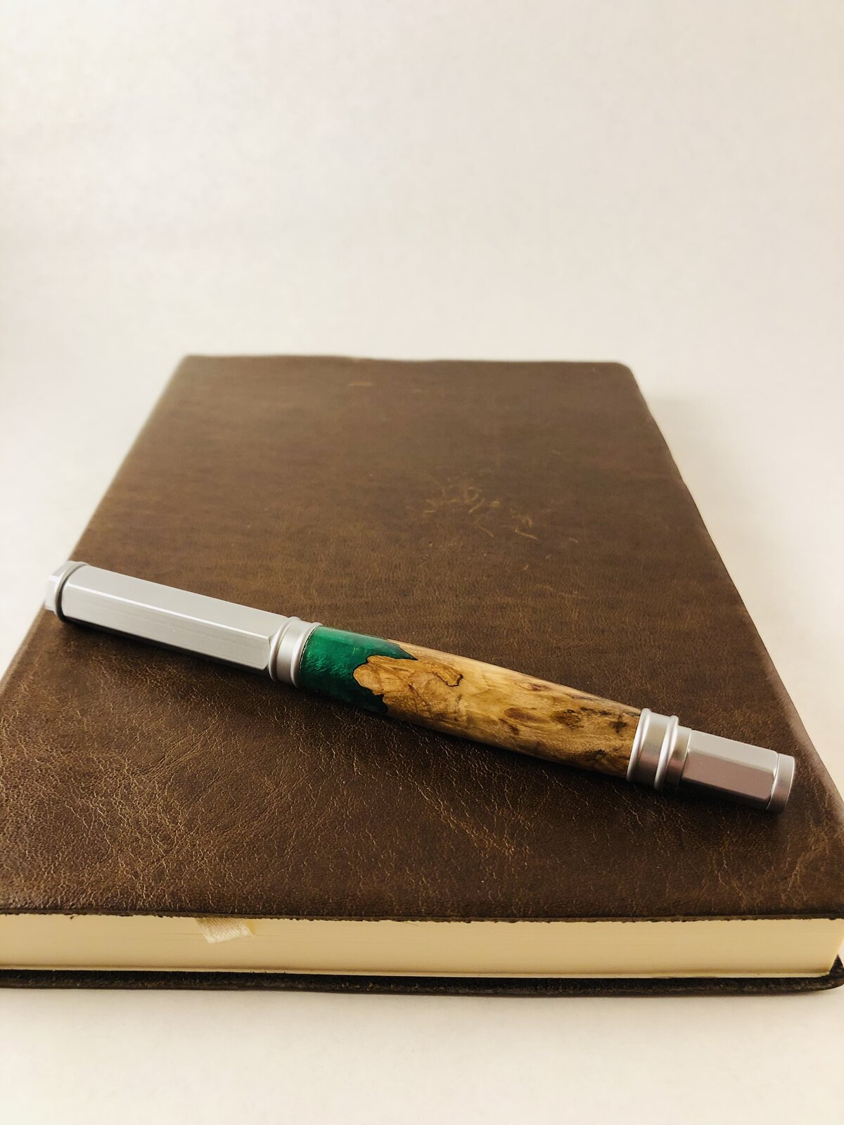 First of all, props to Kevin (@KMCloonan) for making such a beautiful combo of resin and maple burl. I've been really eager to finally get to turning hybrid pens. I like the burst of color without losing the natural beauty of wood and without going full acrylic. This is a Vertex Rollerball with CA finish.
