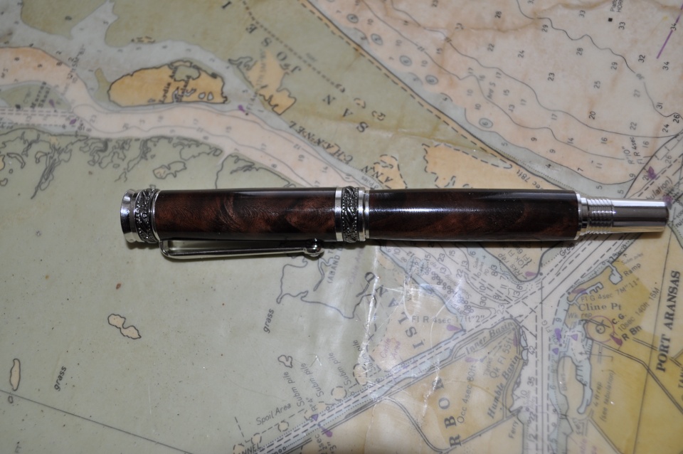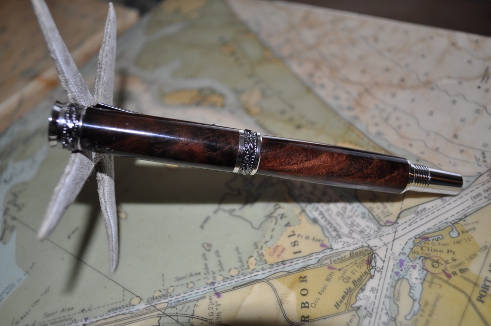 well here is my 4th pen hot off the press, please don't hesitate to let me know what i'm failin at or what to look for. sorry in advance for the photos, i tryed. i figured out i need a lil more sanding around the couplers and have a very few sanding marks left. so thats something to work on.