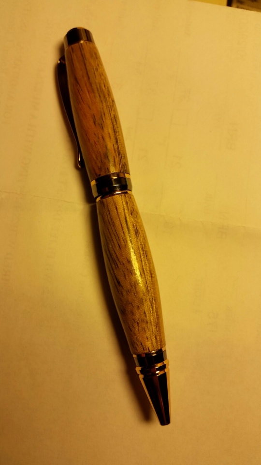 Completed 1st pen and I think I did a pretty good job. The only issue I have is everyone is asking what type of wood I used and I do not have a clue. I purchased a package of 12 blanks on sale from Rockler and nothing was labeled nor did it list any types of wood included. Here are a few poorly taken photos of the pen. If anyone thinks they may know what type of wood it is please let me know.