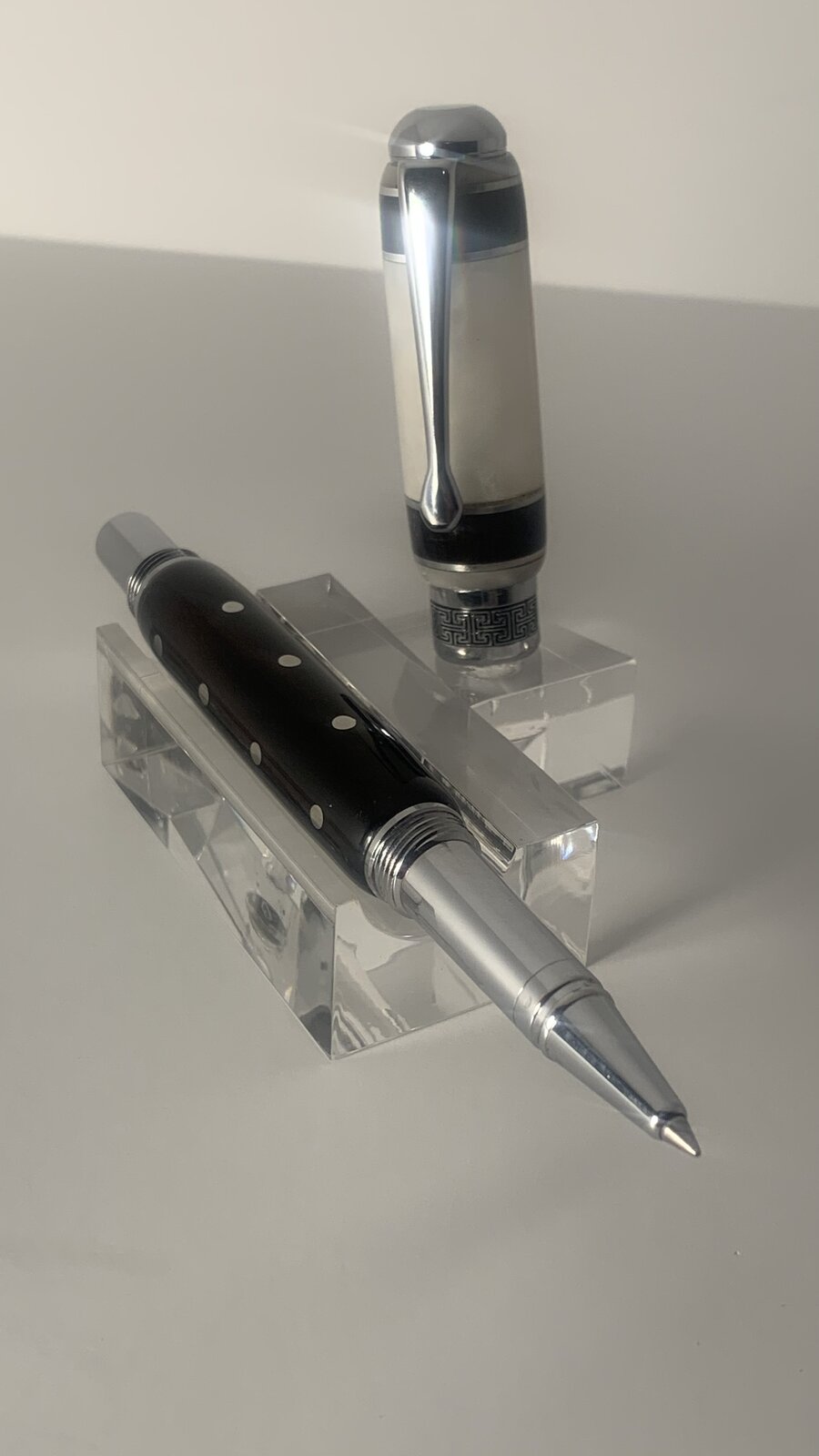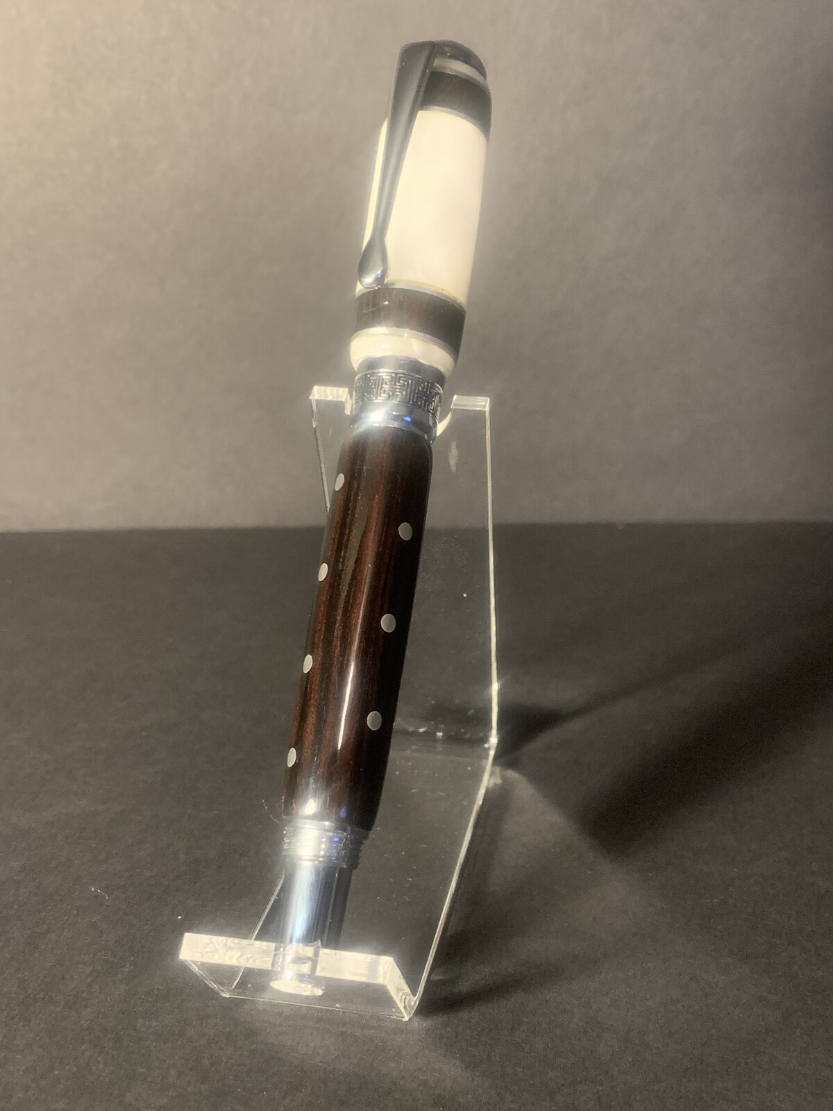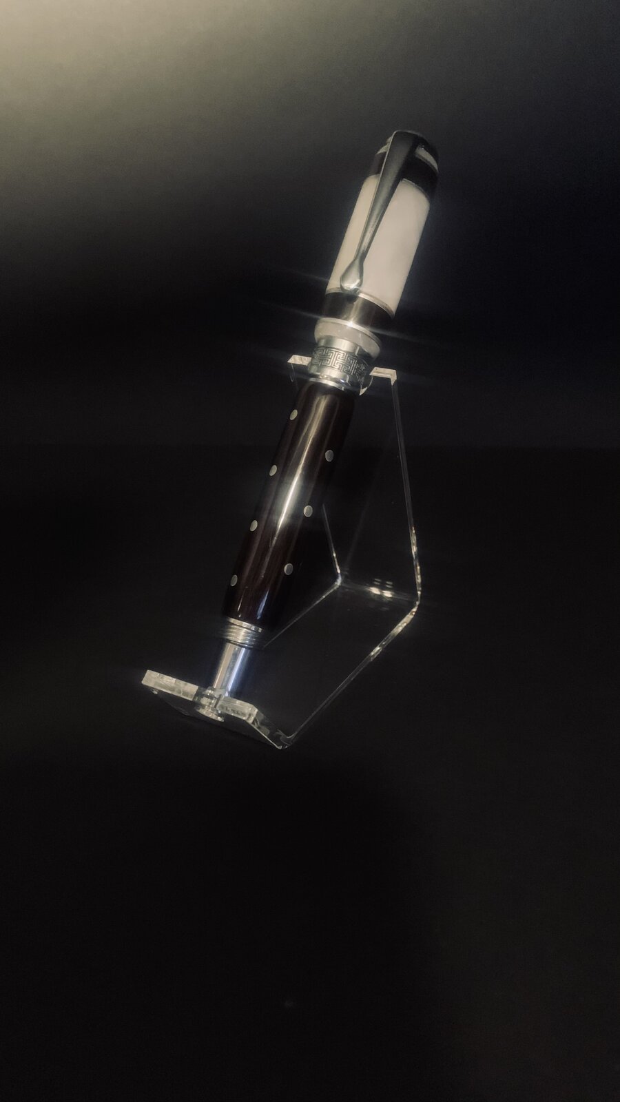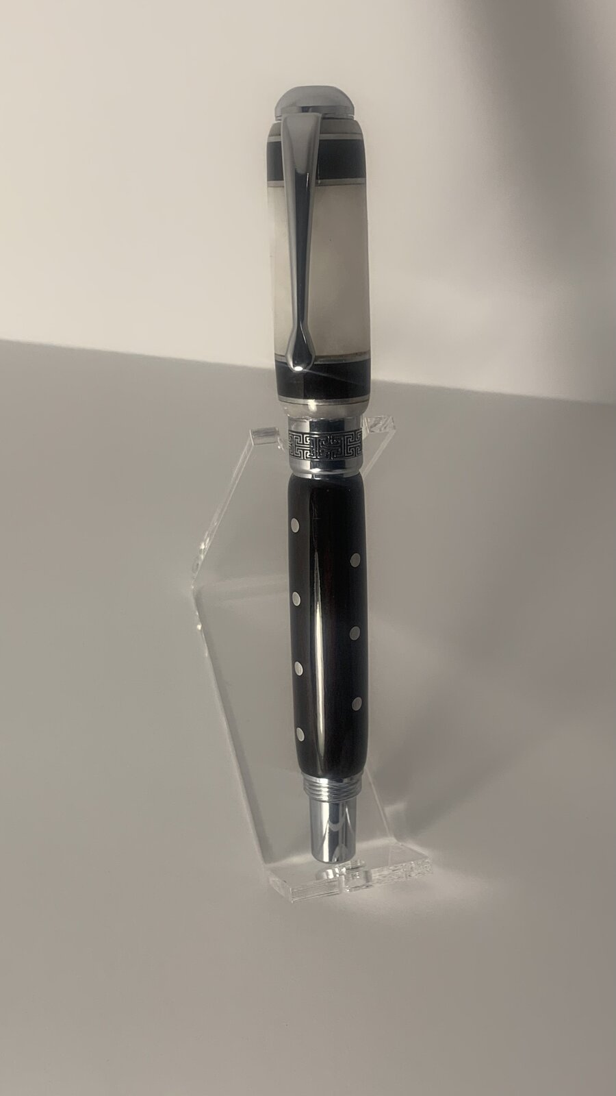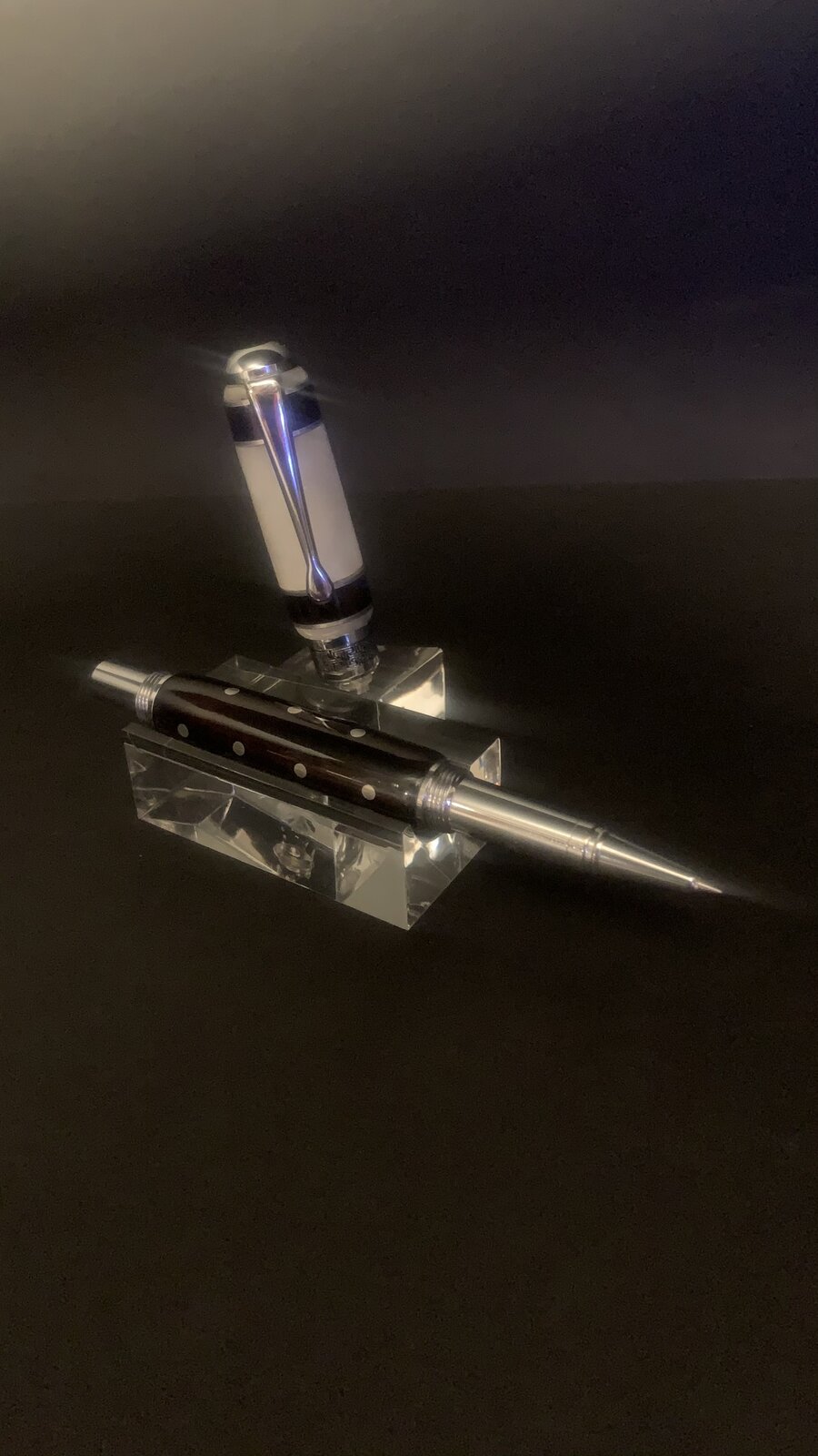 I just finished this pen today. The blanks used were Indian Ebony and Aquapearl, and the kit was New Series from Berea Hardwood. I wanted to try using pins so I decided to go with a 3/32" aluminum rod with an offset pattern. The pen was finished with 7 coats of thin CA polished using MM and then finished on the Acrylic Buffing System. I apologize for the quality of photos as I was struggling to control the glare from the lighting.