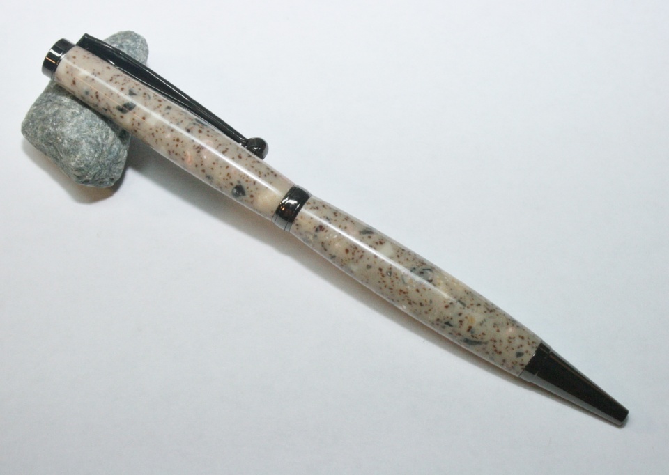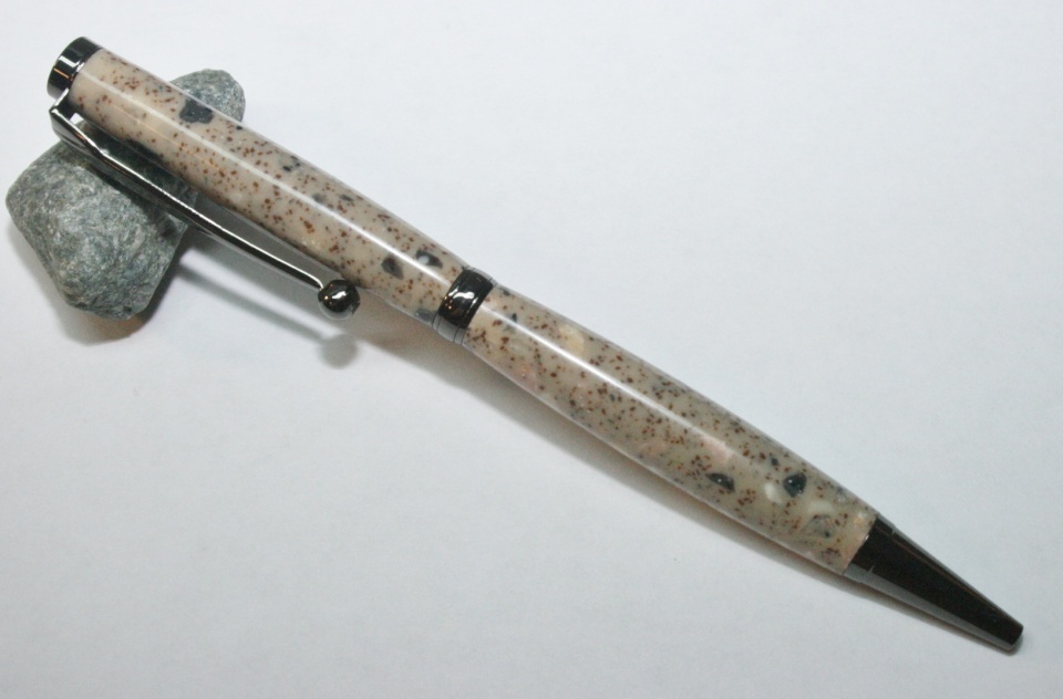Here is my first pen off my new lathe a Rikon 70-220VSR. A gun metal slimline dressed in Corian. I went back to my pen mandrel since I have to idea were my slimline bushings went to. All C & C are welcome