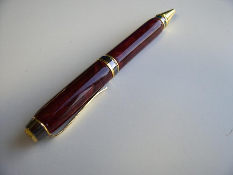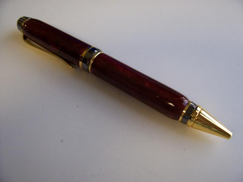 After joining and seeing the nice pens all of you have made, I've been reluctant to post any of my own. This is the first I feel good enough about to post. It is a gold and gunmetal Cigar pen with a Marinara Rhino pen blank. This is one of my first acrylics, but I can tell how well these pen blanks turn, very easy. Also, this is the first pen that I have turned between centers. I crafted the dead center and bushings myself using a metal lathe, and undersized the bushings so I relied on calipers alone for the sizing. I feel this gave a really good custom fit to the pen, with the components matching up well. Please let me know what you think, I'm very open to critiques. Thanks for looking.