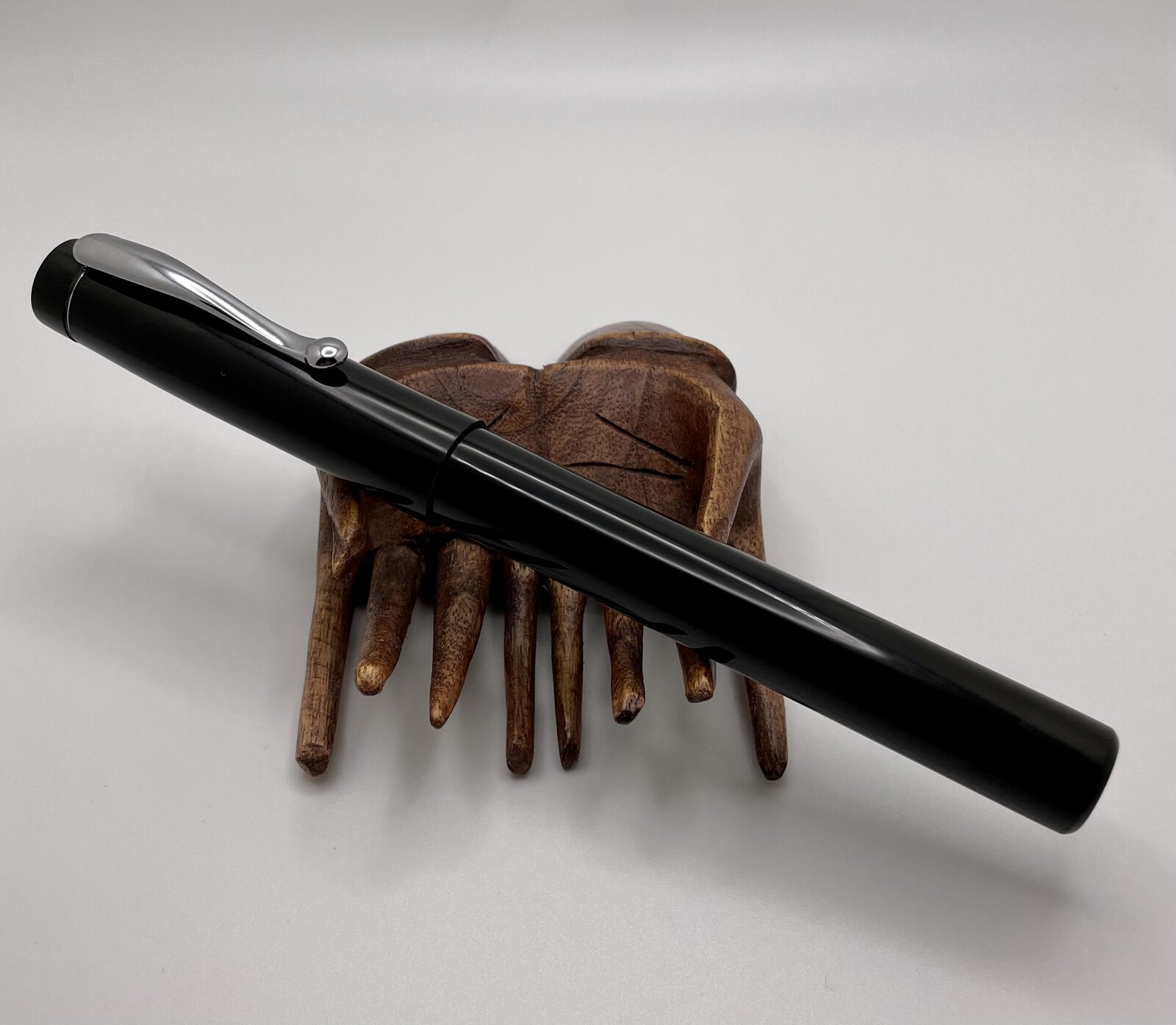 All black Japanese ebonite with an Atrax clip. I was focused on the polishing and I'm happy with it. I usually go for way more color in my pens but the shine on this one is the appeal for me.