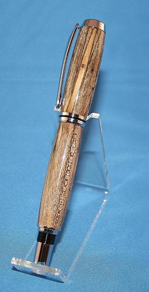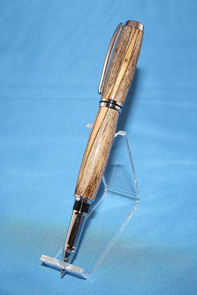 One thing I'd suggest with your pictures is to diffuse your light source (put a thin white cloth or paper between your light & subject, but don't create a fire hazard), and maybe add another light source to the side or rear (also diffused). That will help eliminate the extremes between shadows and highlights. Experiment with different color backgrounds that don't "take over" the image. Maybe we should have a pen photography demo at an upcoming meeting at Woodcraft.