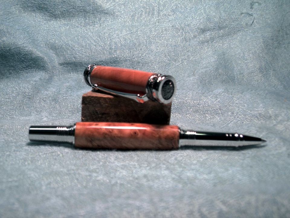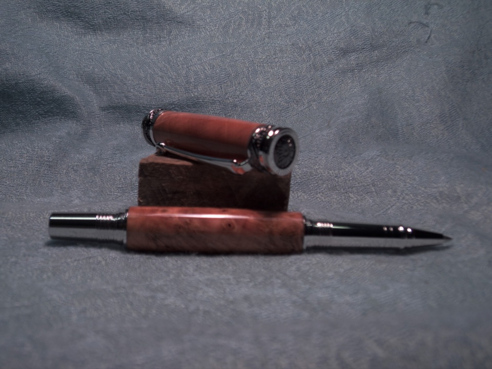 Here's a pic of of a Majestic Jr. in cherry burl with a C/A finish. This was one of my first large pens. I actually made it a couple of years ago. I had originally left it pretty wasp-waisted, and the fit wasn't all that good. It was also an early attempt a CA that hadn't worked out as well as I'd hoped. I came across it and decided to disassemble it, turn it down, and refinish... Pretty happy with it now.