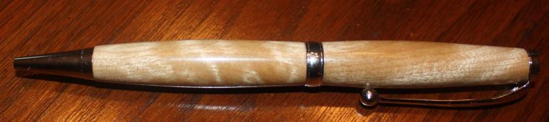 Am a beginning pen maker. This was made with comfort pen bushings. The wood is curly birch. I found about 30 pieces of various sizes in one of our firewood deliveries and have re-sawed some with our band saw sled. Some pieces have nice chatoyance.