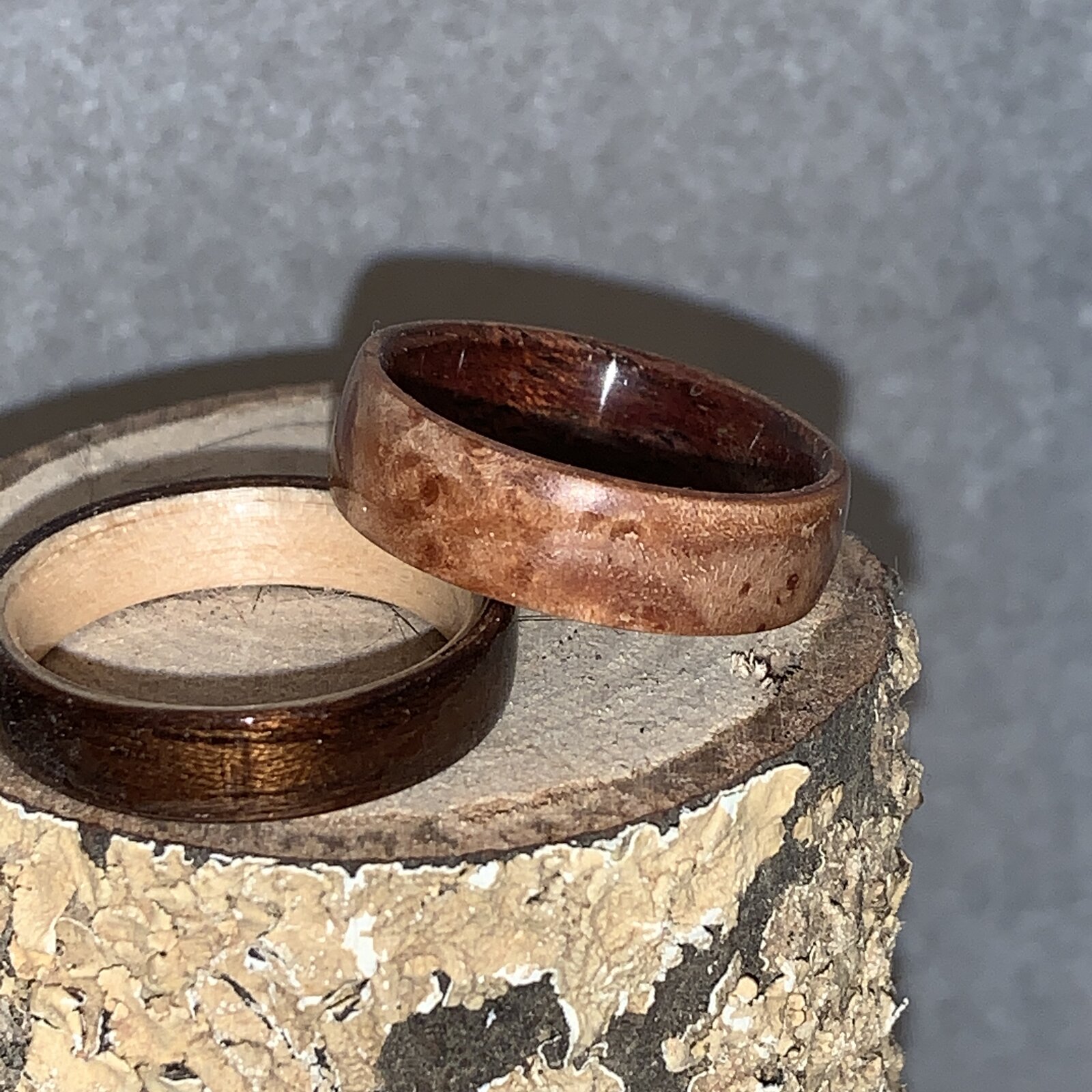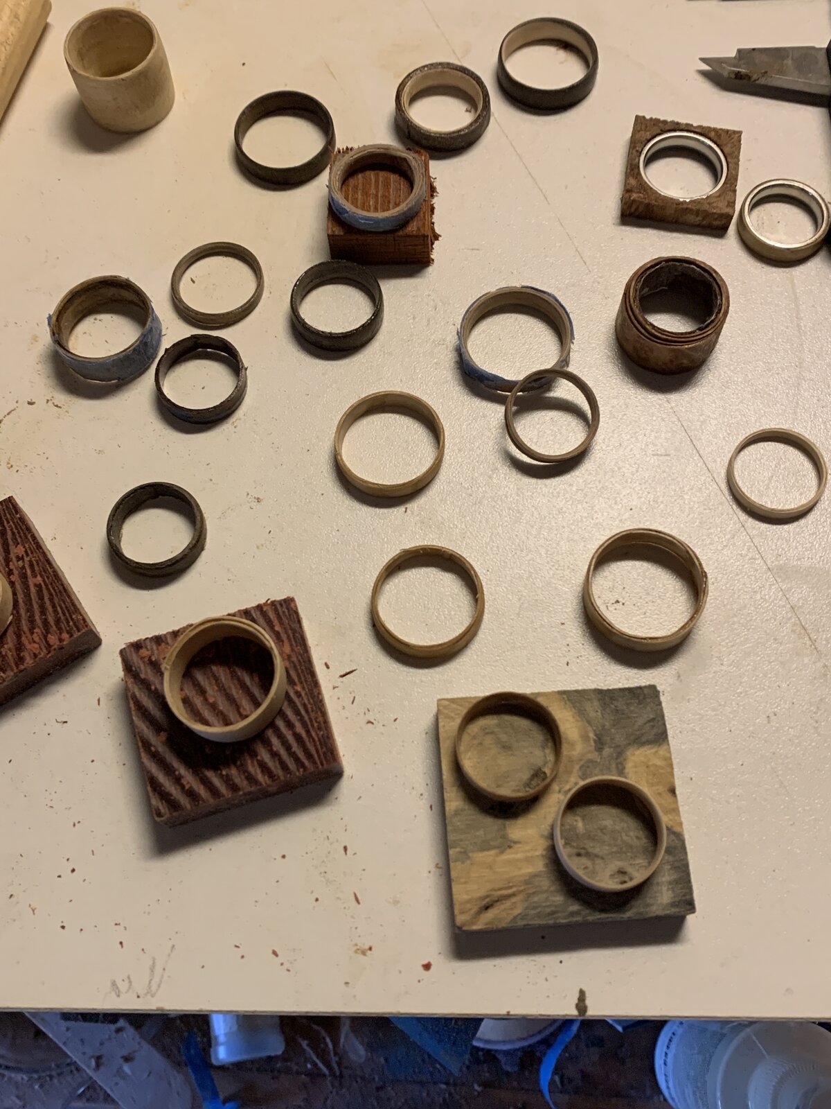 It has been a while! I recently got the urge to try bentwood rings again, this time with a bit of success (and many failures). Pictured are two that mostly worked. The finish, as ever, is very much a work in progress. I used the Sauer hobby pack veneers, so nothing is labeled and everything smells like walnut or mahogany ;). For these two I know the liner is plain maple on the dark one and a very chatoyant dark wood on the outside. The larger ring is maple burl on the outside, not sure about the liner. Not happy with the finish, using a CA brand that's new to me, so working out the kinks and it was a humid weekend and I see some bloom under the finish. That said, it was a fun and sticky process. After boiling and initially bending the strips, I tapered the ends and first rolled two rounds of liner followed by 2-3 rounds of the outer wood. Once dry, I used a set of soft jaws (Dreamwood Rings, 3d printed, fits Nova chucks) on the lathe to even up the outer edge and turned and sanded the inside to a comfort fit. (I should have also done the inside finish at that stage). Then placed on a mandrel and evened and shaped the outside and finished with CA. I made the mistake of finishing the inside afterwards and made a dent in the outside by using the soft jaws to hold the ring. Lesson learned. Anyway, I have lots to play with!:)