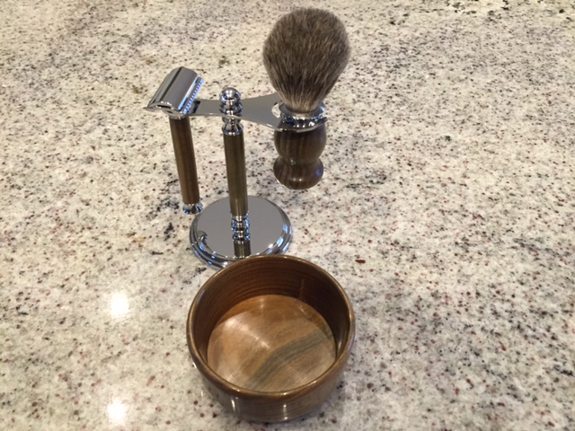 Here's the first shaving items I've made, used Argentine Lignum Vitae. It's still greening up as you can see on the bottom of the bowl but I'm ready to start shaving so wanted to go ahead and get pics :biggrin: Hope you like it, I loved making it, LV is so nice to turn. C&C welcome! Pics aren't great, just snapped with my phone. Still have to get my photo tent set up so I can make barely decent photos again lol. Now to go learn to shave with a safety razor!