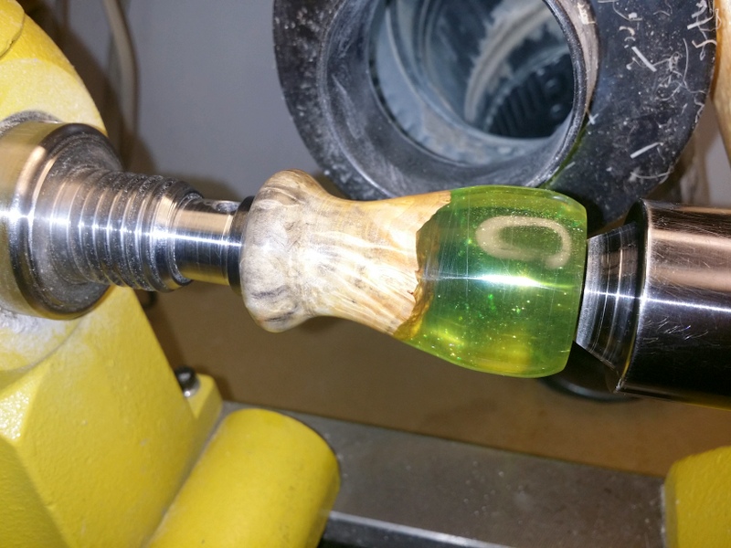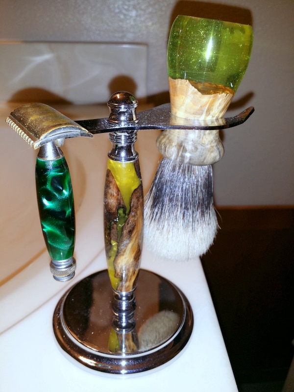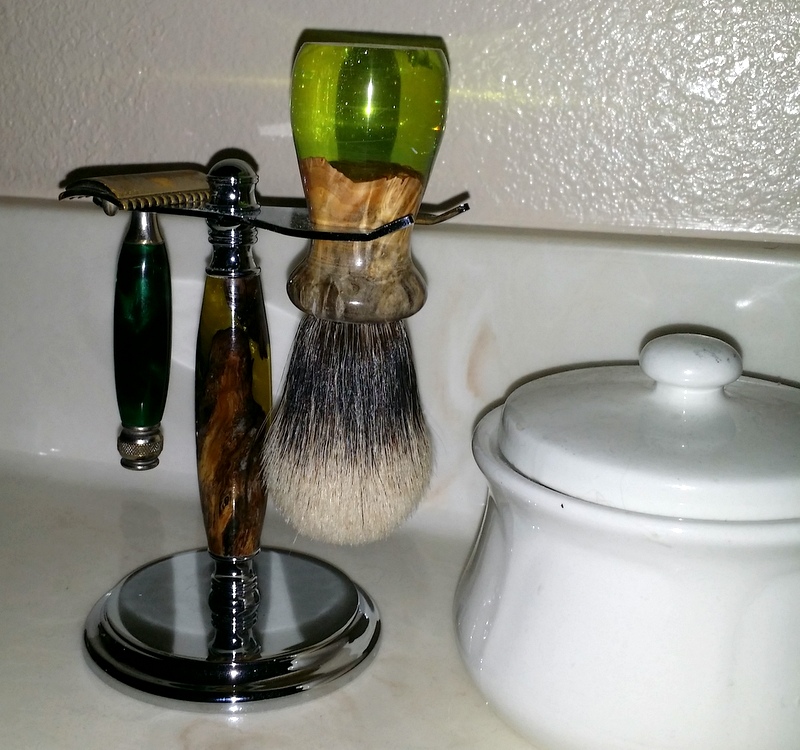 I made my first shaving brush handle. It looked promising on the lathe but after epoxying the brush I realized several errors. I used the hooded live center instead of a conventional live center. This error meant I did not round off the base of the brush nearly enough. I forgot that the bristle end of the brush is light and hangs straight if hung bristle end up which will never do. Why do I do these things especially like experiment with an expensive silver tip brush and expensive blank? So goes the story of my life. I may just have to give it to someone I don't like along with a razor with a rusty blade.