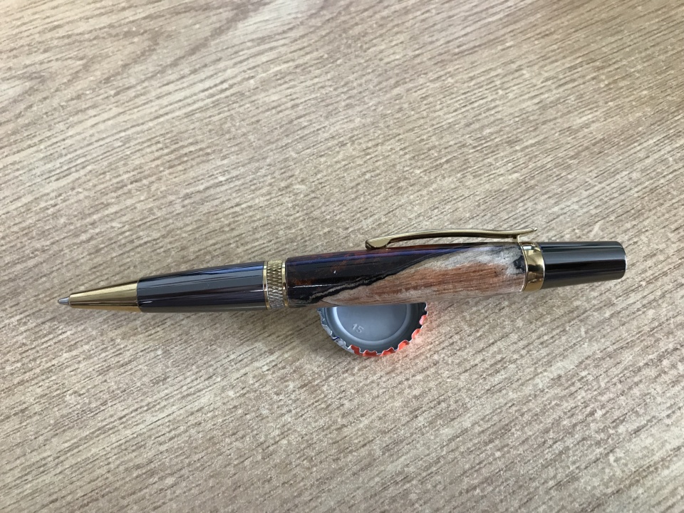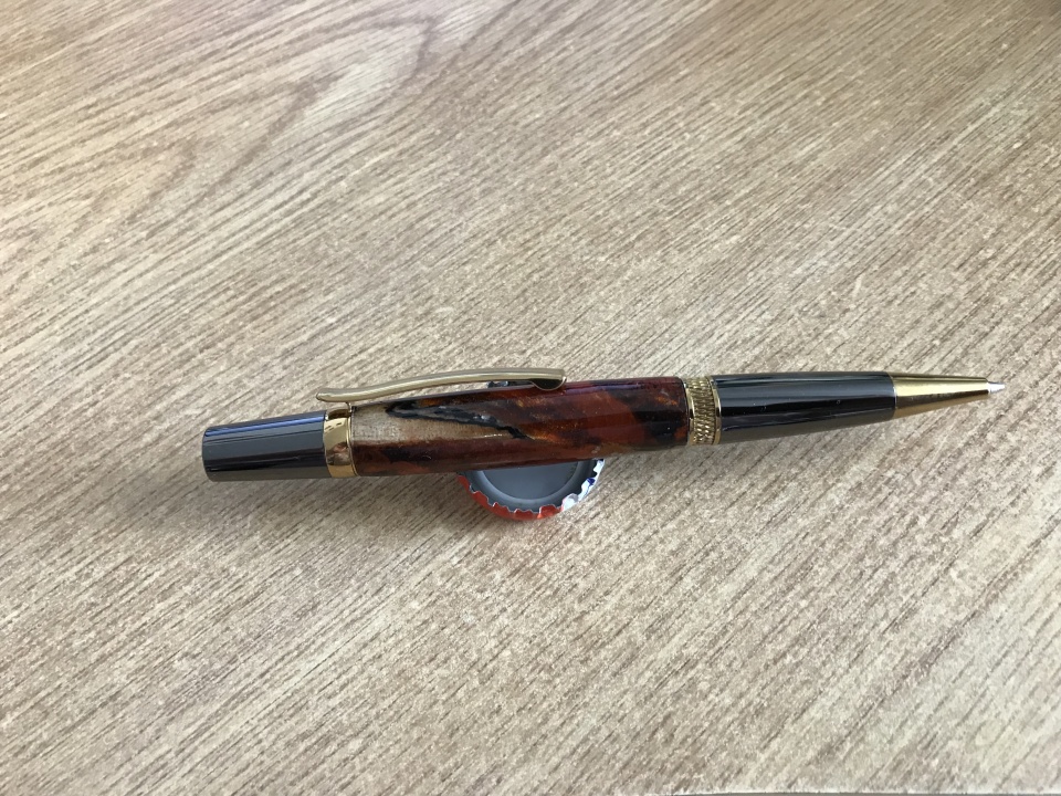 This pen just came out of my pocket. I've been carrying it for a couple of weeks. It is what I consider to be my first cast blank that worked well. It is a piece of spalted maple burl paired with some orange alumilite. There is a little bronze powder in the alumilite, too.
