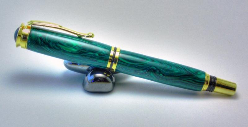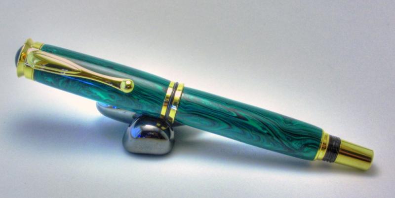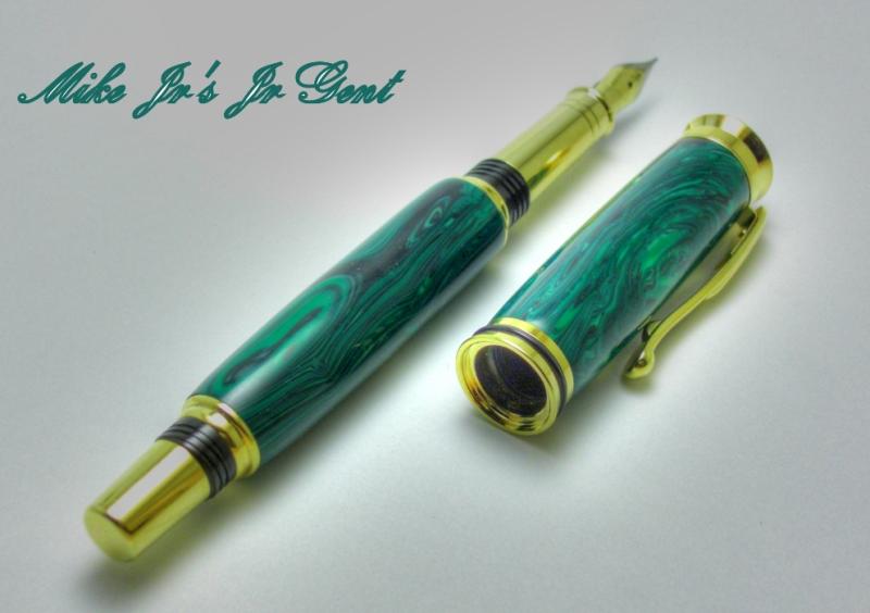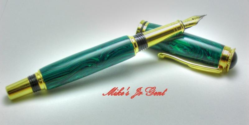 I don't turn a lot of Pens, I have probably made less then 20 total. So there is a lot of first's in this pen for me, first FP, first high end kit, and first trustone and the first one that I made that is just for me the way I wanted it. It is green banded Malachite on a gold retro jr gent. It has been MM to 12K and plstix polished. My Dad got some of the trustone blanks and he gave me my choice so I took the green to go with the gold kit.