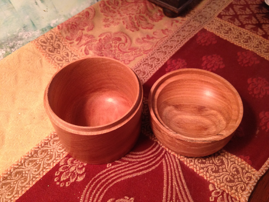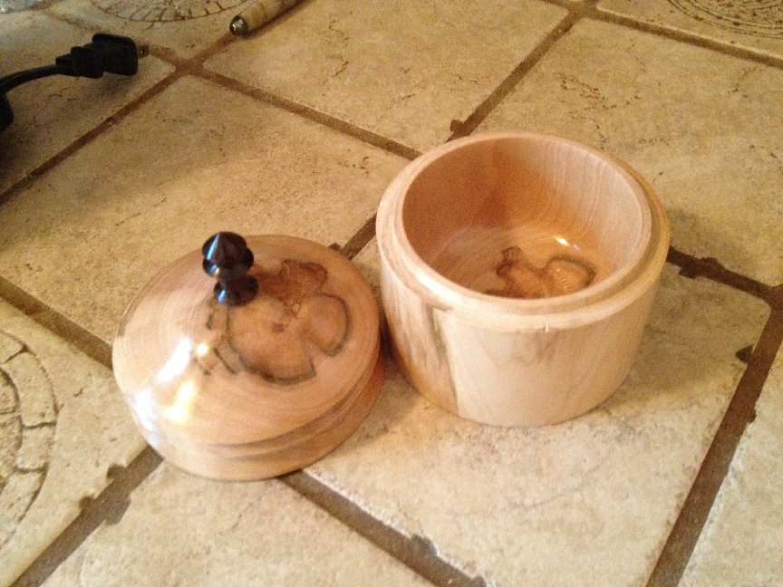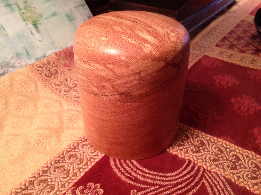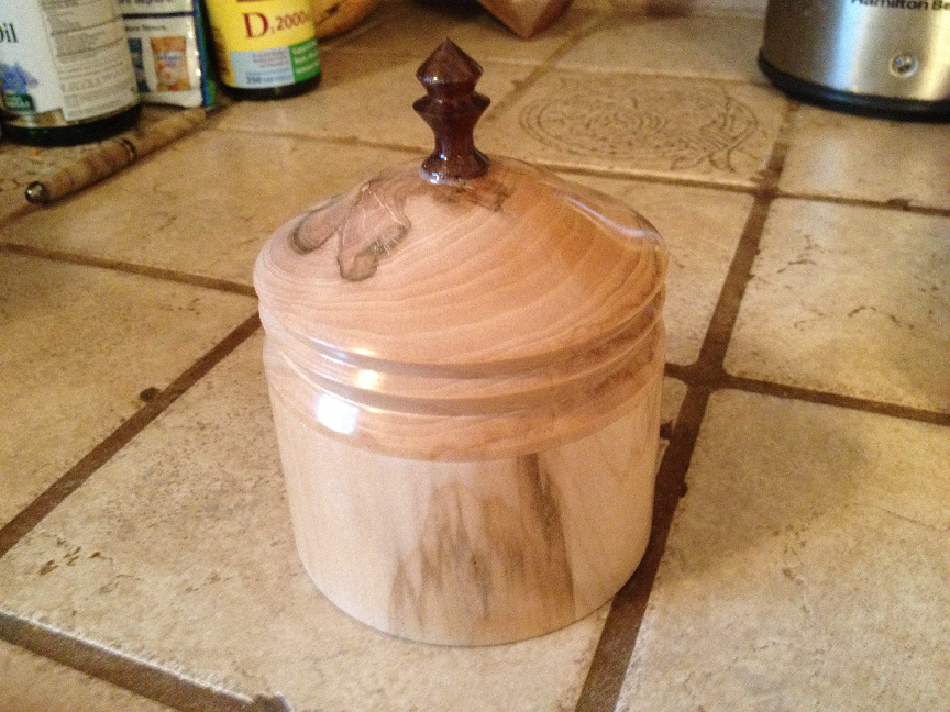 Made my very first yesterday with I believe is spalted red sycamore and finished with Tung Oil and paste wax. It's 3" in diameter and 4" tall. My second I just now finished and made it with a piece of sycamore from my brother-in-law's tree he trimmed a branch off of last summer. The finial is Leadwood and finished that one with Mylands Friction Polish. It stands 4-1/2" tall and is 3-1/2" in diameter. These are actually pretty easy to make.