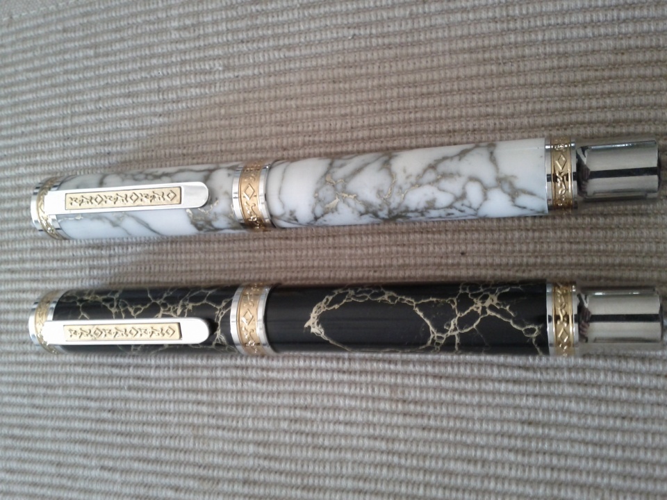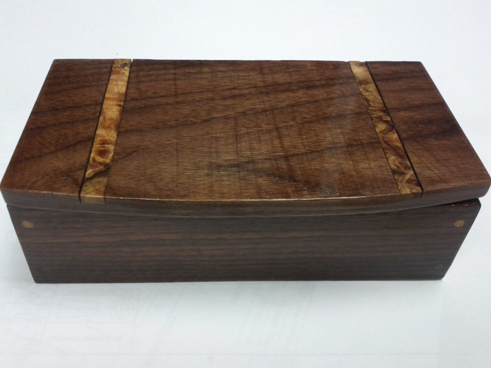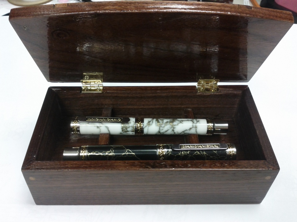 This is my first wedding set. I made it for my syster and her fiance. It's a set of Spring Blossums dressed in Tru-Stone blanks. (sorry for the bad picture on the pens, didn't have my little booth set up last night) Thought about throwing them in a couple seperate leather cases, then thought my big sis deserves a little something better than that, so I mad the box you see below. Not my best work on the box, but I'm more of a turner, don't do much flat work. The box was from scrap walnut I had laying around and some unknown accent wood.