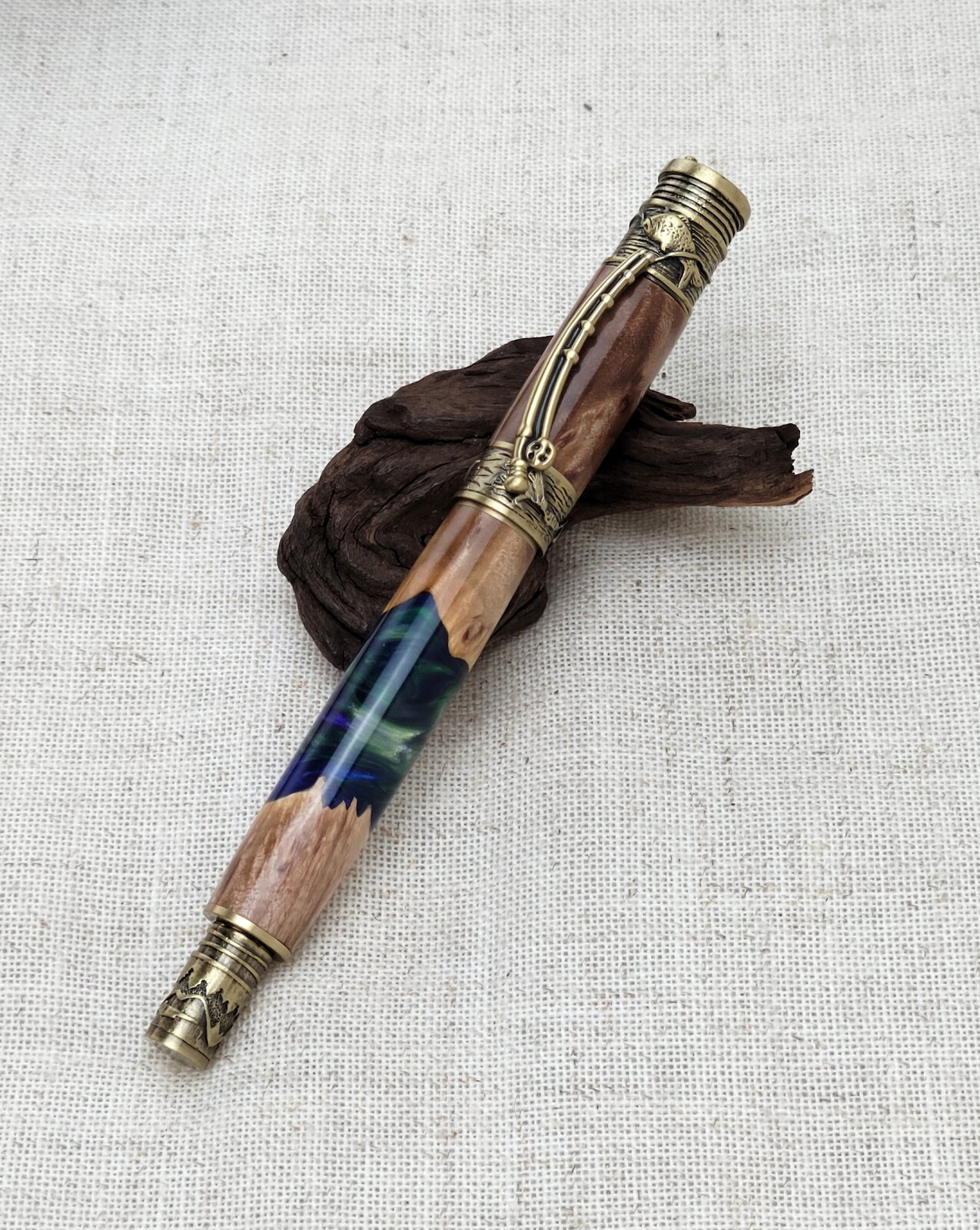 I don't do a lot of themed pens, but can't resist doing one now and then. This is a PSI Fly Fishing rollerball in hybrid maple burl and alumilite from JakobJanssenStudios store on Etsy. I've had good experience with his blanks. The finish is a few layers of medium, and then thin, GluBoost, wet sanded/polished through the Zona grits. I left the lower barrel slightly bulged to resemble a fishing pole grip.