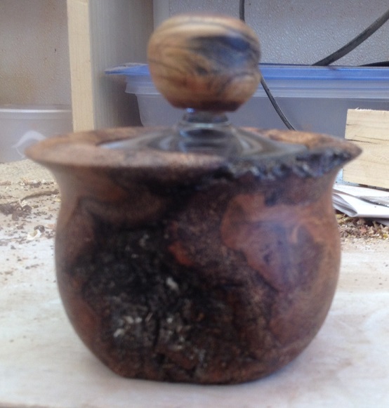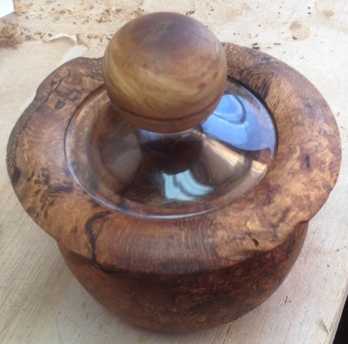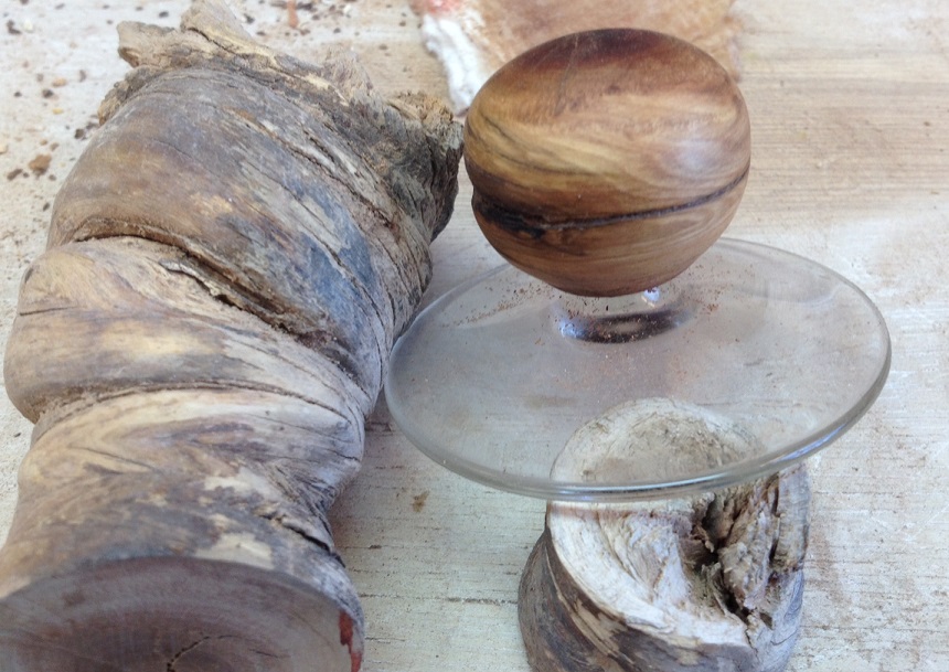 I think the wood is oak burl and had a nice earthy smell as I turn it. The top is the foot of a wine glass I cut off when making wooden stems for the glasses. (note: Easy to cut a wine glass stem is to use an angle grinder with a thin metal cutting blade, just start the cut and the foot separates clean and easy). The nob is from a piece of wood given me by a friend not sure what it is but I included a piece in the picture.