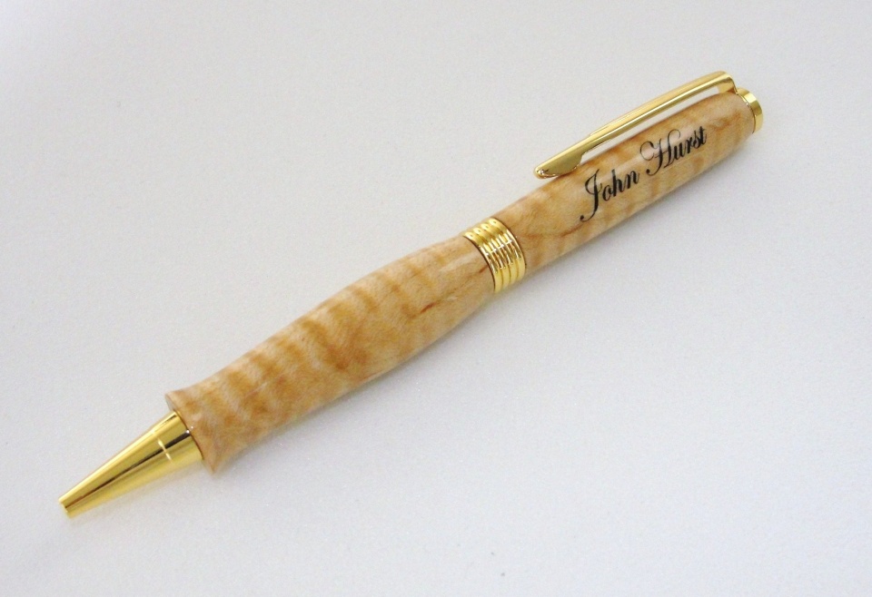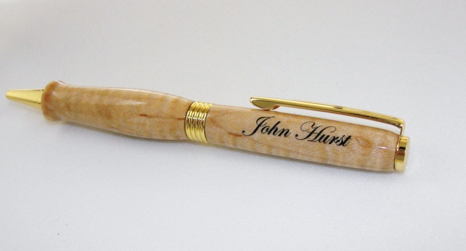 Tiger maple with a decal that actually turned out well this time. This is for my friend and former band mate John who now has Parkinsons. A very good song writer, guitarist, and 3 Stooges knuckelhead who, like me, knows every line and has the good taste to have me as a bass player. Has the shakes now but not lost the sense of humor and love of life. We will be collaborating on another CD and with luck will turn out a few more tunes. The pen is shapped so it can be held easily. A little wider than most but for him it works.