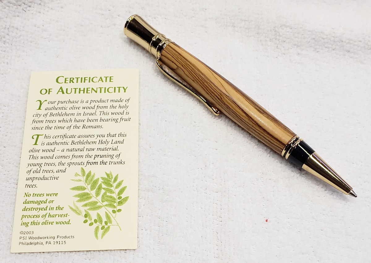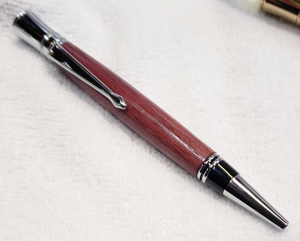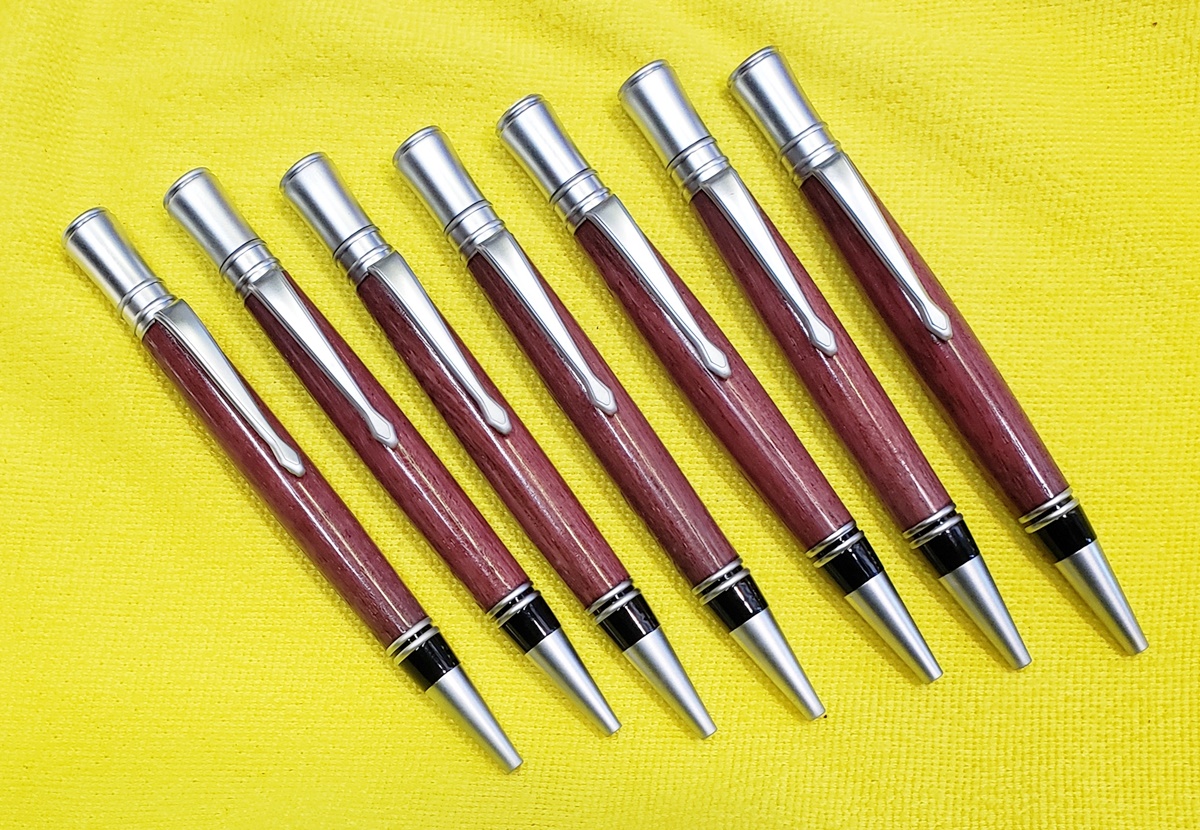 I have done this in the past, and decided to do it again this year. I made pens for the girls at work. I chose Executive kits, seven satin, one chrome, and one gold. I used purple heart for eight of them, and Bethlehem olive wood for the ninth. The olive wood pen is for a girl who was recently baptized. I love doing this, it makes them very happy.
