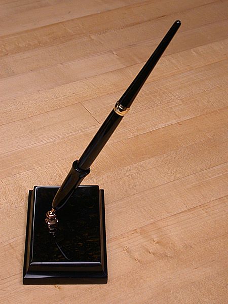 I've recently added desk pens to my line of custom fountain pens (I also have ball-point pen sets and I'm working on pen/pencil sets). The pen shown is made from Inlace Acrylester, and the color is called Golden Black. As the name implies, it's mostly black with a nice faint gold lace pattern that can be seen clearly in the right light. The desk pen has a solid base with an ogee routed edge, a threaded funnel, and custom brass centerband.