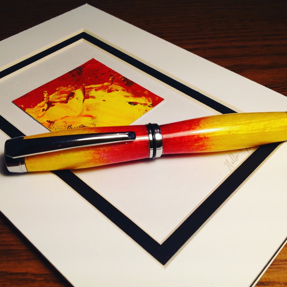 Magpens. The painting was done on the tube. I used 3 different types of paint. Acrylic,a medium and a French paint I have as well as different textures brushes. There were probably 6 different layers. The thickest was the first layer and the rest of them were really thin and translucent to get that affect. It is hard to remember how I got the final product cause I can't remember everything I do when I paint. I keep adding different things until I get the result I like.