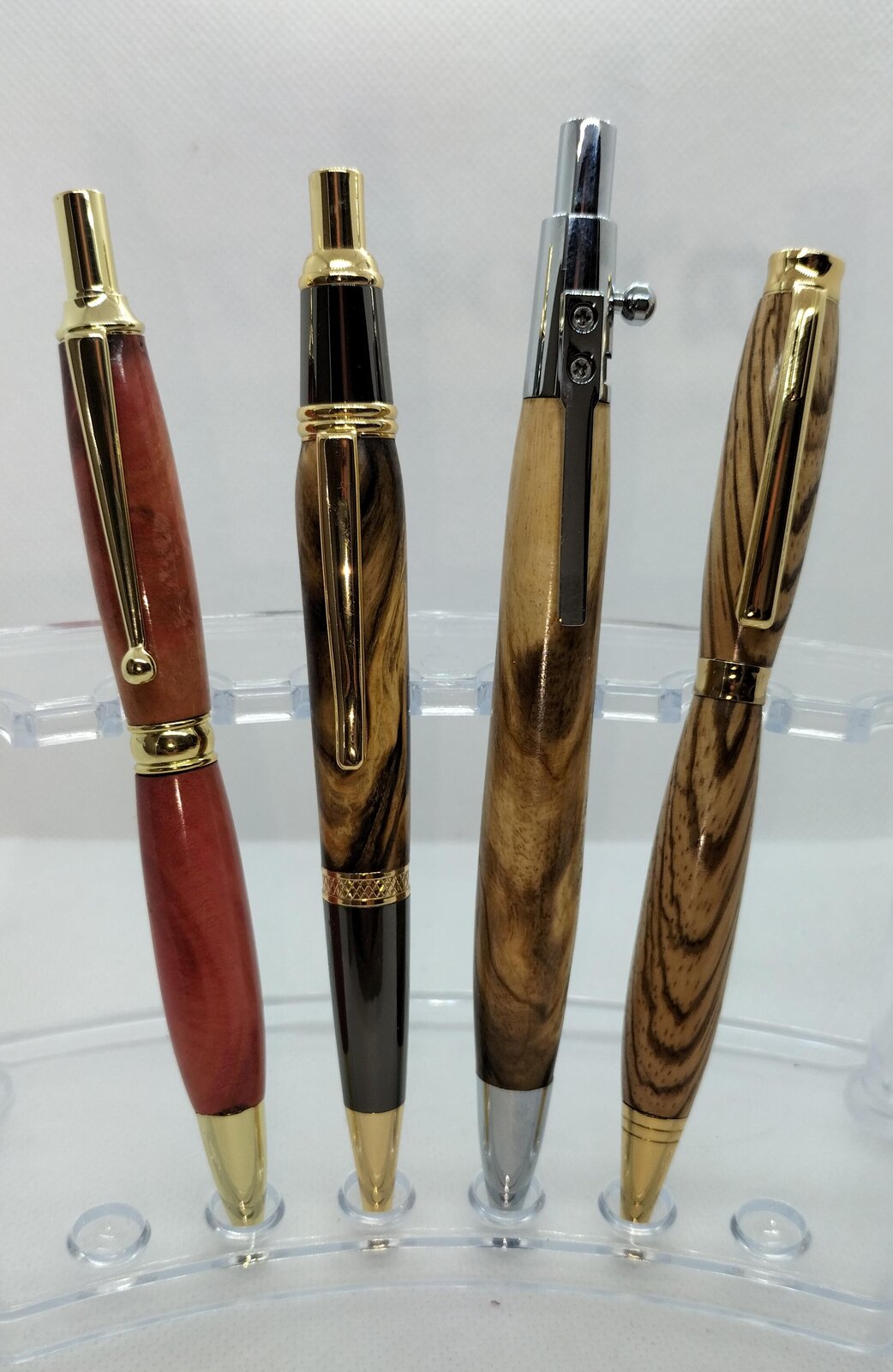 Made today using Wood's I like 2 Hornbeam 1 Zebrano and 1 Pink Ivory. The Pink Ivory gave me the usual chipping problem and the Hornbeam chipped a little , but with a little CA and sawdust able to hide the problem. Also I am not a fan of the Bolt action kit the clips are short and lack spring.