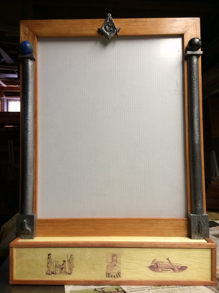 The Mason Bling post in the Penturning Forum got me thinking I should share this pic. My son was raised in the spring. This is a frame for his certificate and an apron box. The Sq&C was cast in resin, as was the Plumb and level.