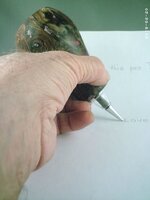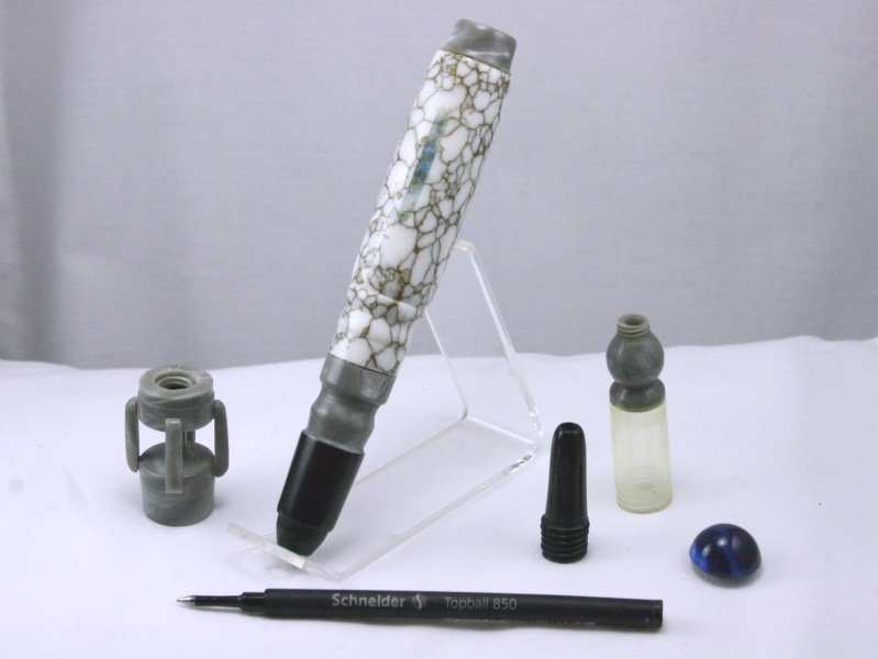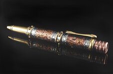 Tell us about your entry: Breaking Down Barriers My inspiration for this pen came from the story in Ezekiel 26:9 where King Nebuchadnezzar used his trusty battering ram to destroy the gates of Tyre. A battering ram was a siege weapon used in ancient times to break open fortification walls or doors. In its simplest form, a battering ram is just a large, heavy log carried by several people and propelled with force against an obstacle such as the gates or doors of a fortress. The momentum of the ram would be sufficient to damage the target if the log were heavy enough, or if it were moved quickly enough. My creation started coming together in April. I wanted the wheels to have the feel of logs fastened together, so I segmented and turned each wheel from 15 pieces of wood and veneer. Each wheel is attached to the frame using 7mm tubing for the axle, slimline finials inside and an unknown cap finial for the outside hub. I made washers from cork as spacers between wheel and the siege engine. The frame is built from reclaimed tornado damaged oak using rough cut lumber to simulate battle worn wood. The roof was stripped with oak also for the additional protection it would provide. I took tanned cow leather and cut it to resemble animal skins before attaching them to the roof (these would be soaked with water before battle to extinguish the fiery arrows). I painstakingly made each arrow with toothpicks and what I believe to be pieces of pheasant feathers, attaching each arrow as if had been shot as the attack was starting. The pen is semi kitless. I used tubes from an Imperial for the pen body, and the nib and feed section from an old Olympian that I had parted out previously. The Ebony is charred on the back end as if it had been burned by a fiery arrow. The cap is the all business end of this one. I took copper pipe and split the end to make the spikes to hold the fire. I secured it to the end by using wooden spikes made from toothpicks. After completion I took a limb saw to scrape the ram to create grooves. The cradle that holds the ram is made of walnut held by leather lacing attached to the top of the frame. After completing the entire build, I took a torch and flamed the entire battering ram to give it the war worn look a real siege weapon deserves. Thanks for looking and I hope you enjoy the Birthday Bash.