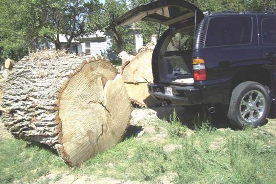 I was driving by a house where they cut down a pretty big tree. I stopped and asked the guy what they were going to do with the wood. He said I could have it - if I can fit it in my truck! That log is 5'2" across the middle. WOW is all I could say. (no I was not going to try to get it in the truck, just wanted to show the proportion of size).