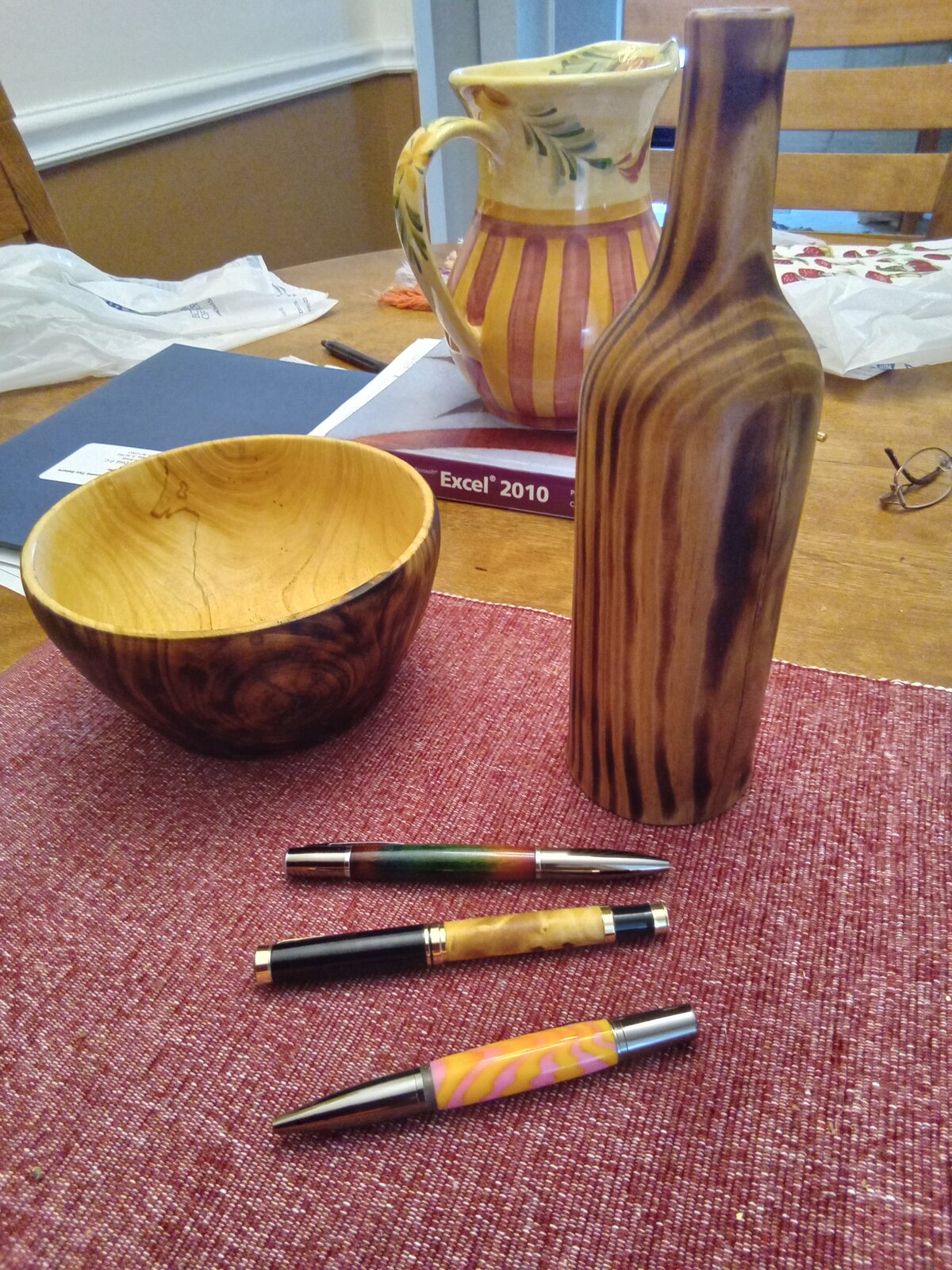 Took the morning off and did a rainbow dyed cherry wood yari, an acrylic Bella, and an Oxford with buckeye burl. Also finished off an elm bowl (charred the outside) and a pine bottle I'll use to display bottle stoppers.
