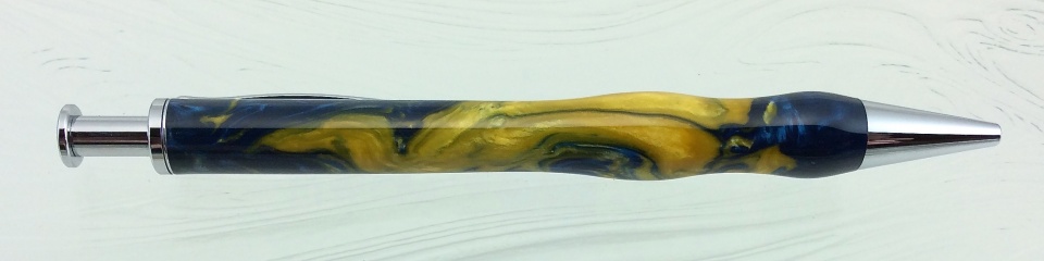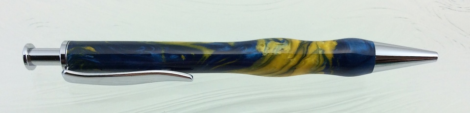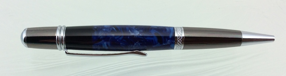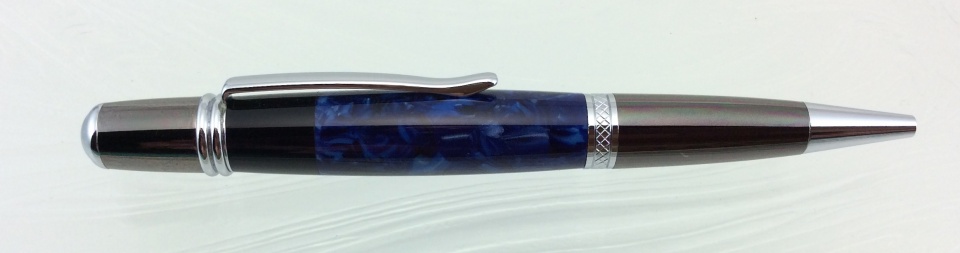 The first is is a Wall Street II with an italian resin blue blank. I think I received the blank in a swap. I found out that these resins have a low melting point especially when drilling! All went well till it was wet sanded, polished and buffed. I found a shady/cloudy area on one end. To save the blank, I parted off that area and glued on a piece of blank acrylic, turned and finished again.