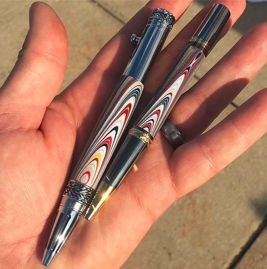 I send up to 12,000 and then do 3-4 layers of CA and sand back to 12,000 and then buff. After all automotive paint should look like automotive paint. I like to pair the fordite with a fun gear shift pen or a classy majestic pen.