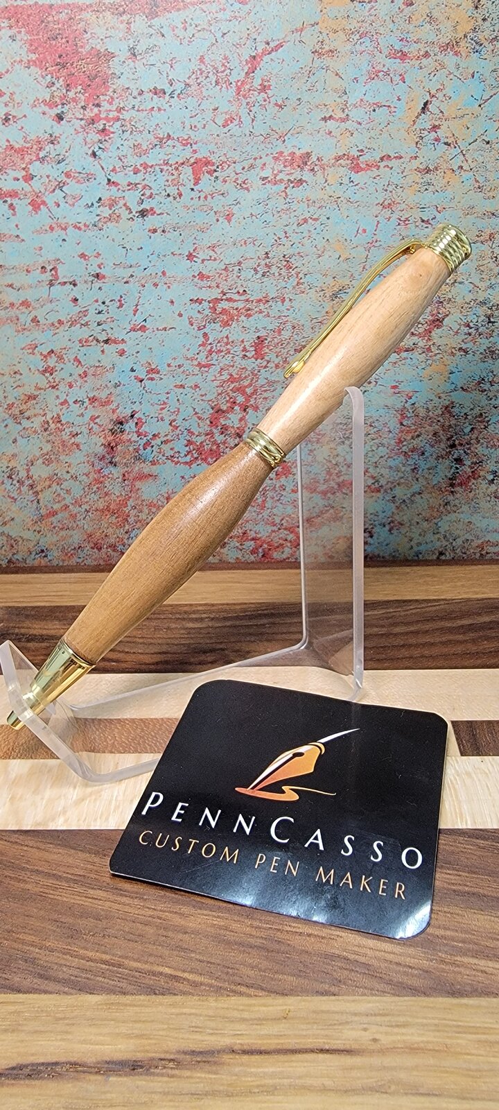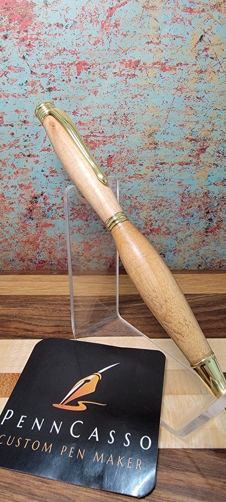 I was visiting and a gentleman was cutting this Willow tree from inside a creek and so I stopped and asked him if he could cut me a small log to put in my luggage. Had to put the log in a plastic bag, due to it being completely wet. This was hard to turn, made this pen for a friend that is here visiting from Viselia, CA.