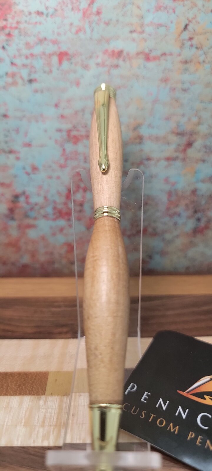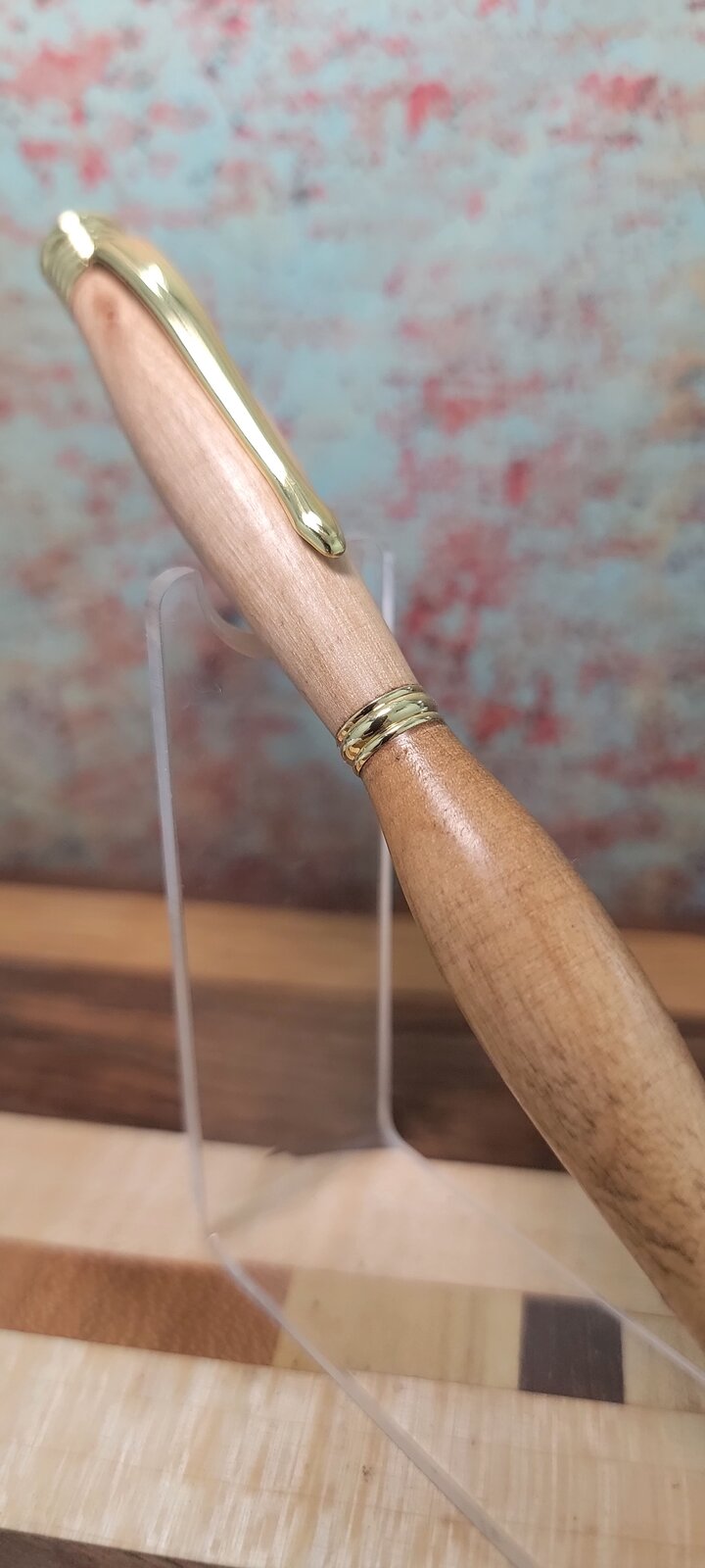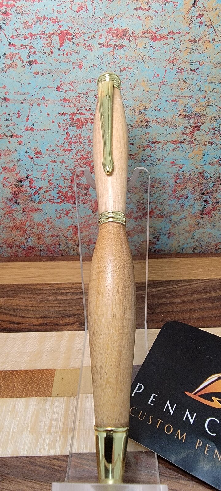 I also like turning slimline kits and one decision I tried and liked was moving away from the kit-supplied centerband. I replace it with a nice little piece of wood. If I drill a 0.25" hole through the middle I can turn it with my top and bottom sections. This lets me show off a complimentary species of wood, but also means I can continue to explore interesting shapes without being stuck with the standard centerband size.