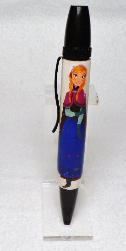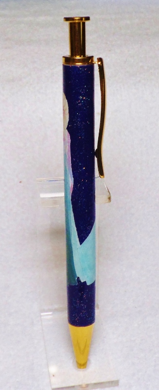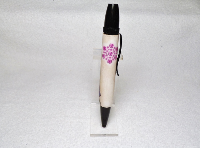 Second is Elsa on a Artisan Patriot Pen kit in Black Chrome from CSUSA. A Maple blank also was the base for this pen. Barrel was coated in Snow White, Elsa added, and again Deco-Podge was used to seal the entire pen. A mauve snowflake was added to the rear of the pen, and 15 coats of thick CA used for the finish. Sanded to 600 and Polished with One-Step. Jim S