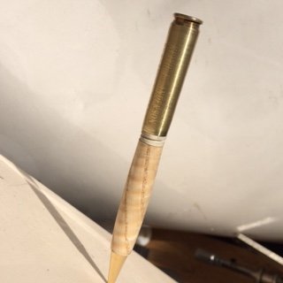 This pen has a Cartridge as the top barrel and tiger maple as the bottom barrel. The cartridge comes from the memorial service of my friend.