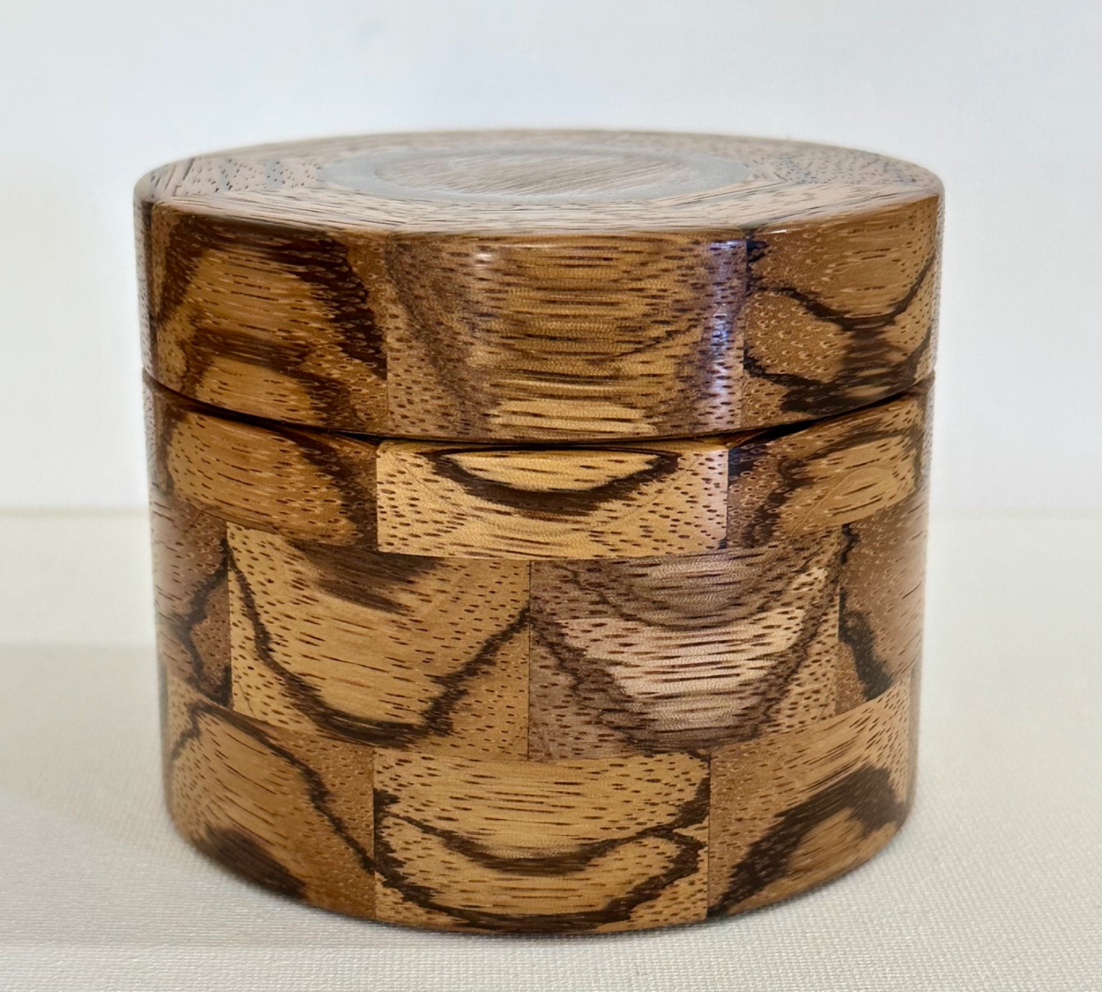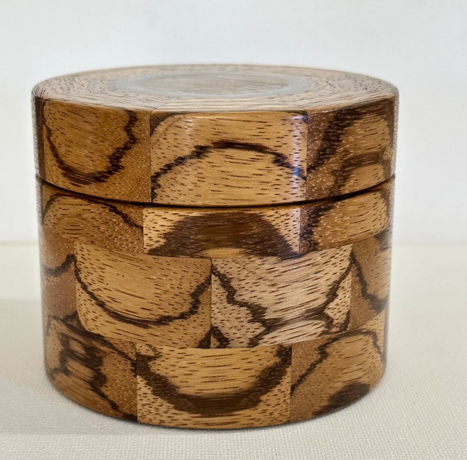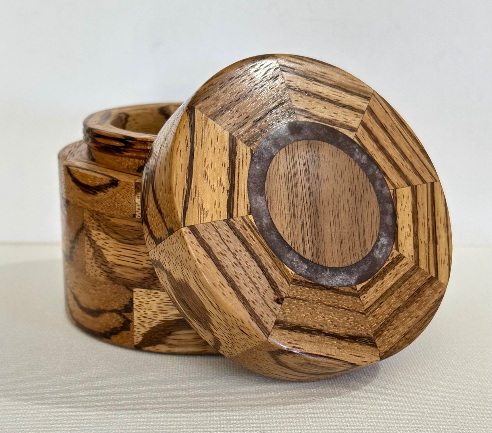 When I've made these in the past consisting of four layers, I only segmented the middle two layers. This one, all four layers are segmented. It turned out great. Turning was very easy as there is no end grain to turn. The main wood is Zebra wood with a center accent of walnut and amethyst powder inlay. I'm very happy with segments, they are tight.