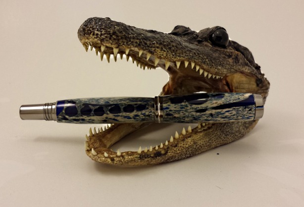 Here is my first gator blank in blue resin that I made as a commisioned pen from my favorite customer. It is wrapped around a black titanium JG2 rollerball. This was a fun and stressful turn but the finished results were well worth it. C&C always welcome