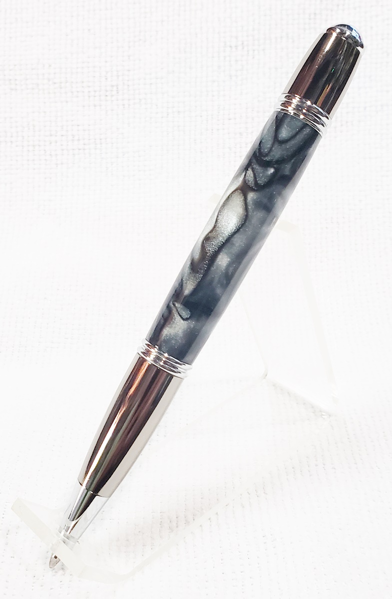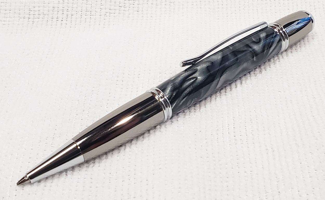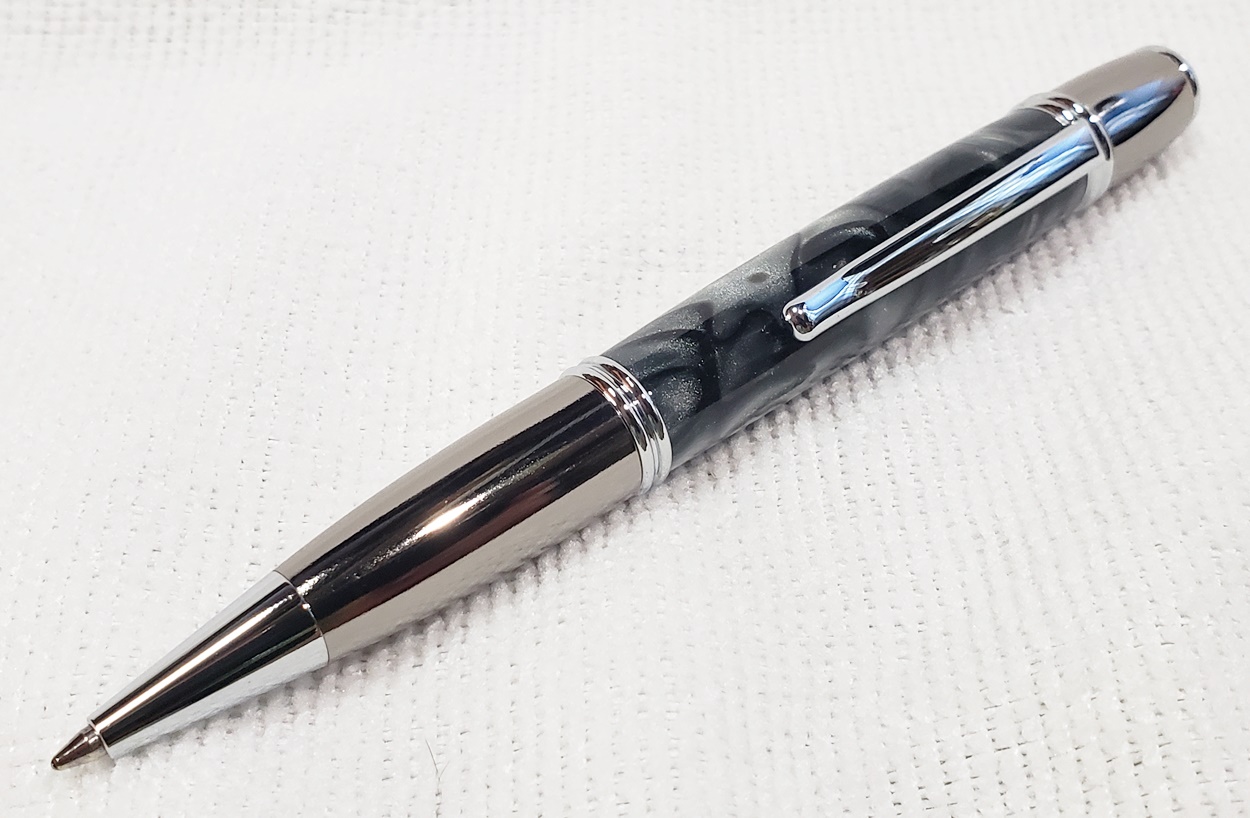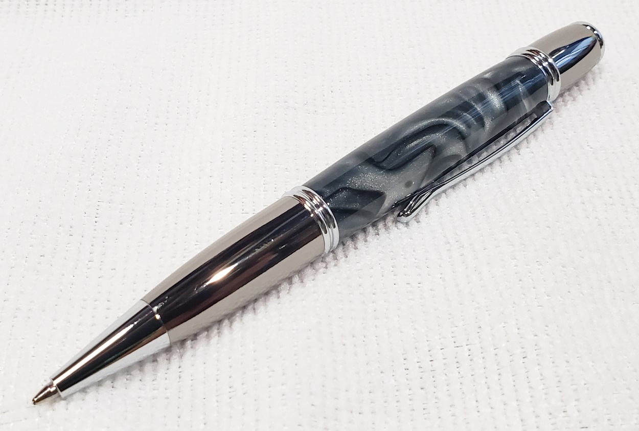 This is a PSI Gatsby in chrome and gunmetal, from Rockler. The blank is an AA called Black Ice. Made a handsome pen.