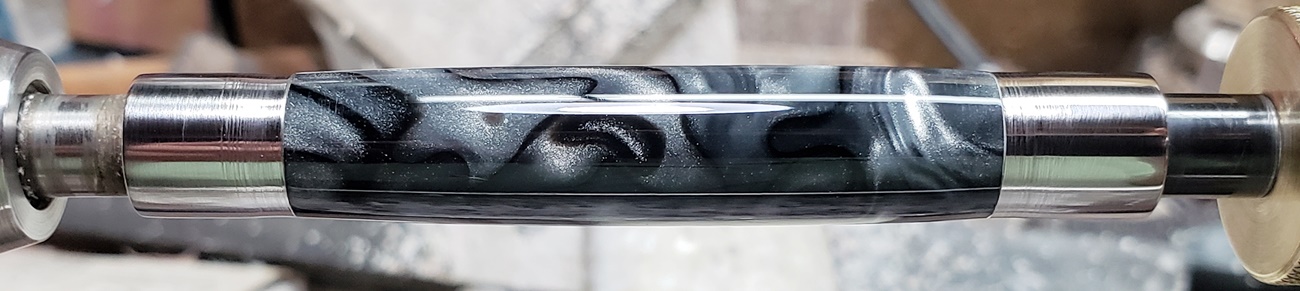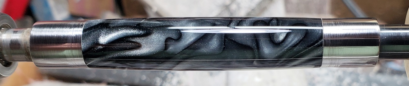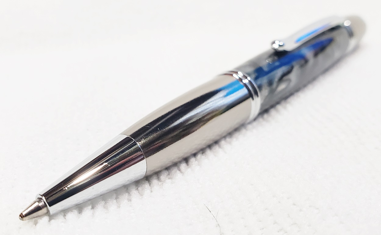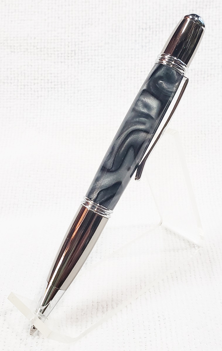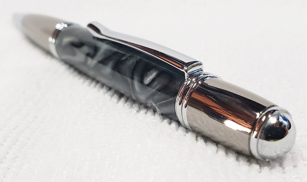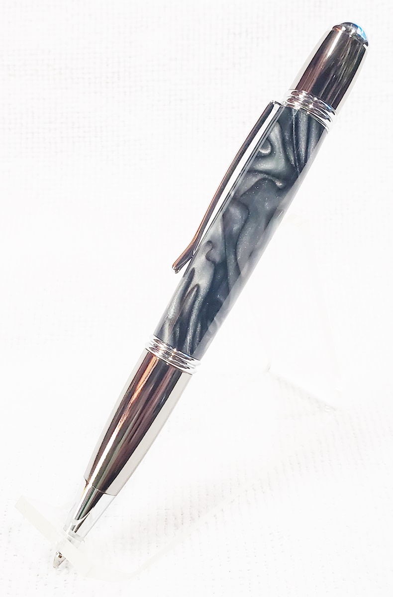 This is a PSI Gatsby in chrome and gunmetal, from Rockler. The blank is an AA called Black Ice. Made a handsome pen.