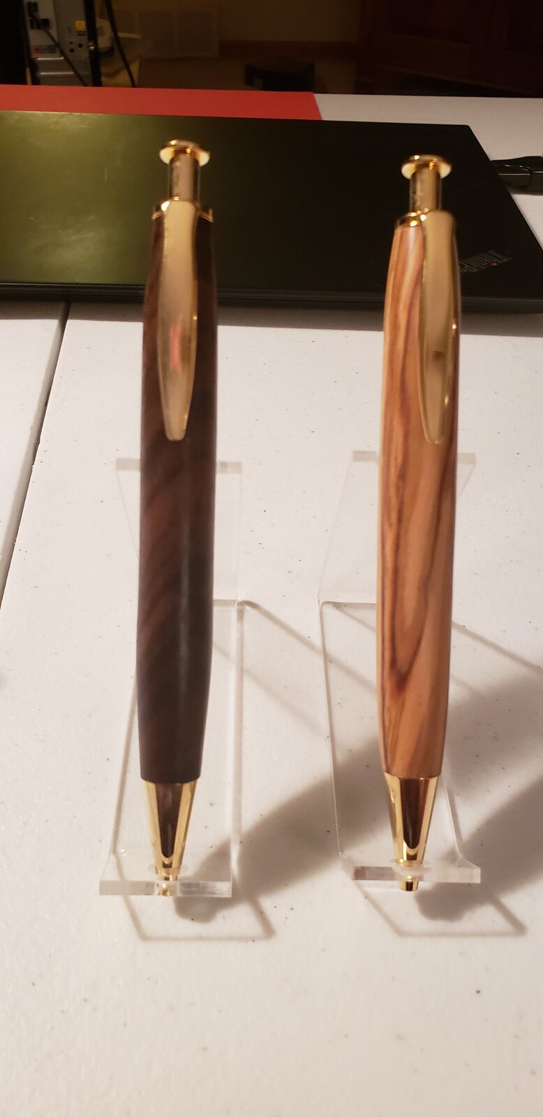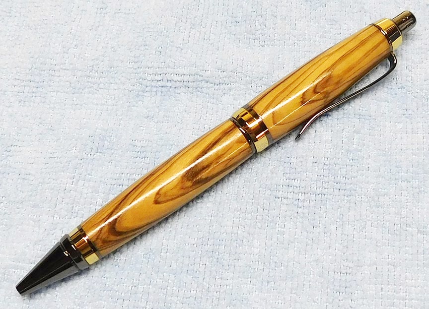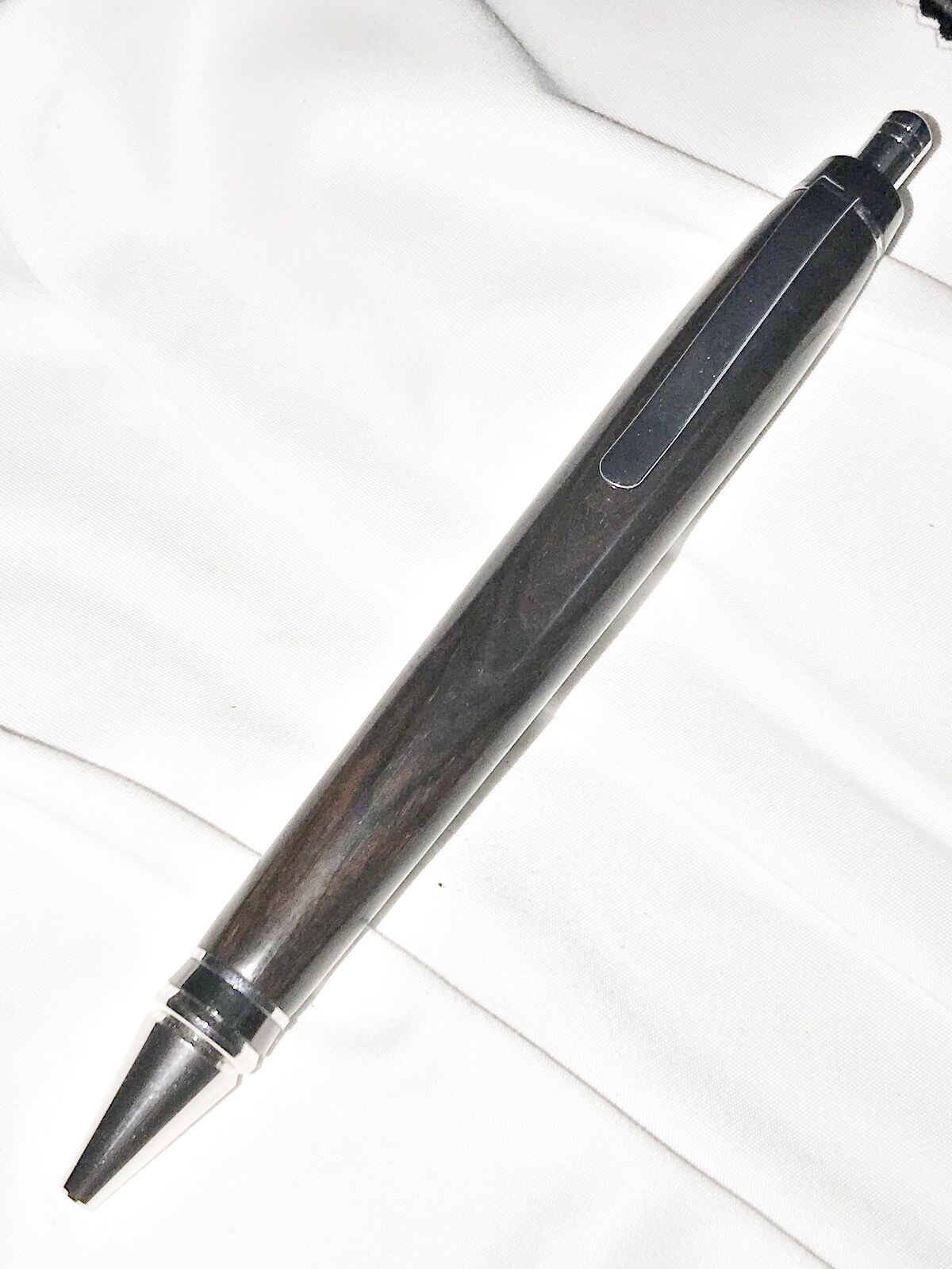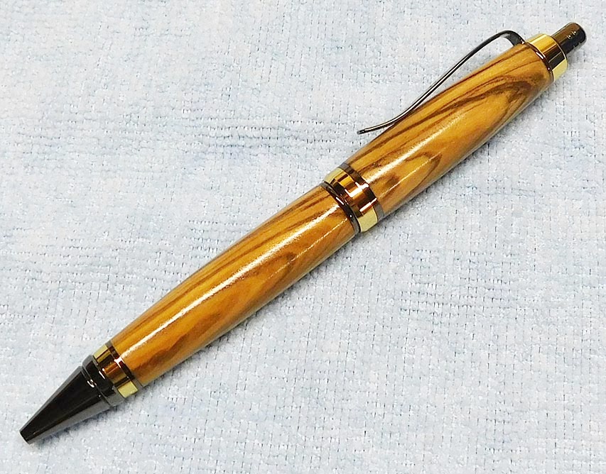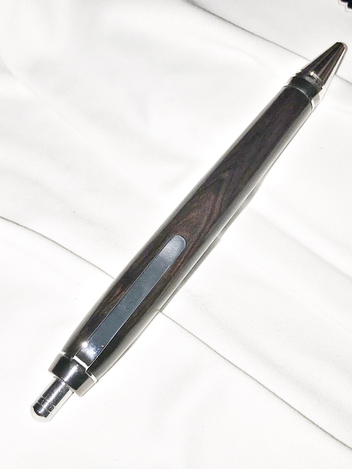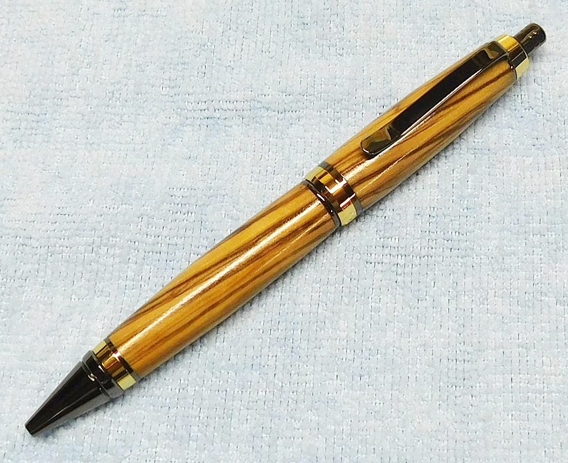 The Long Wood click pen from Rockler is similar. Drilling them out was a pain, but these turned out okay. They are zircote and olivewood.